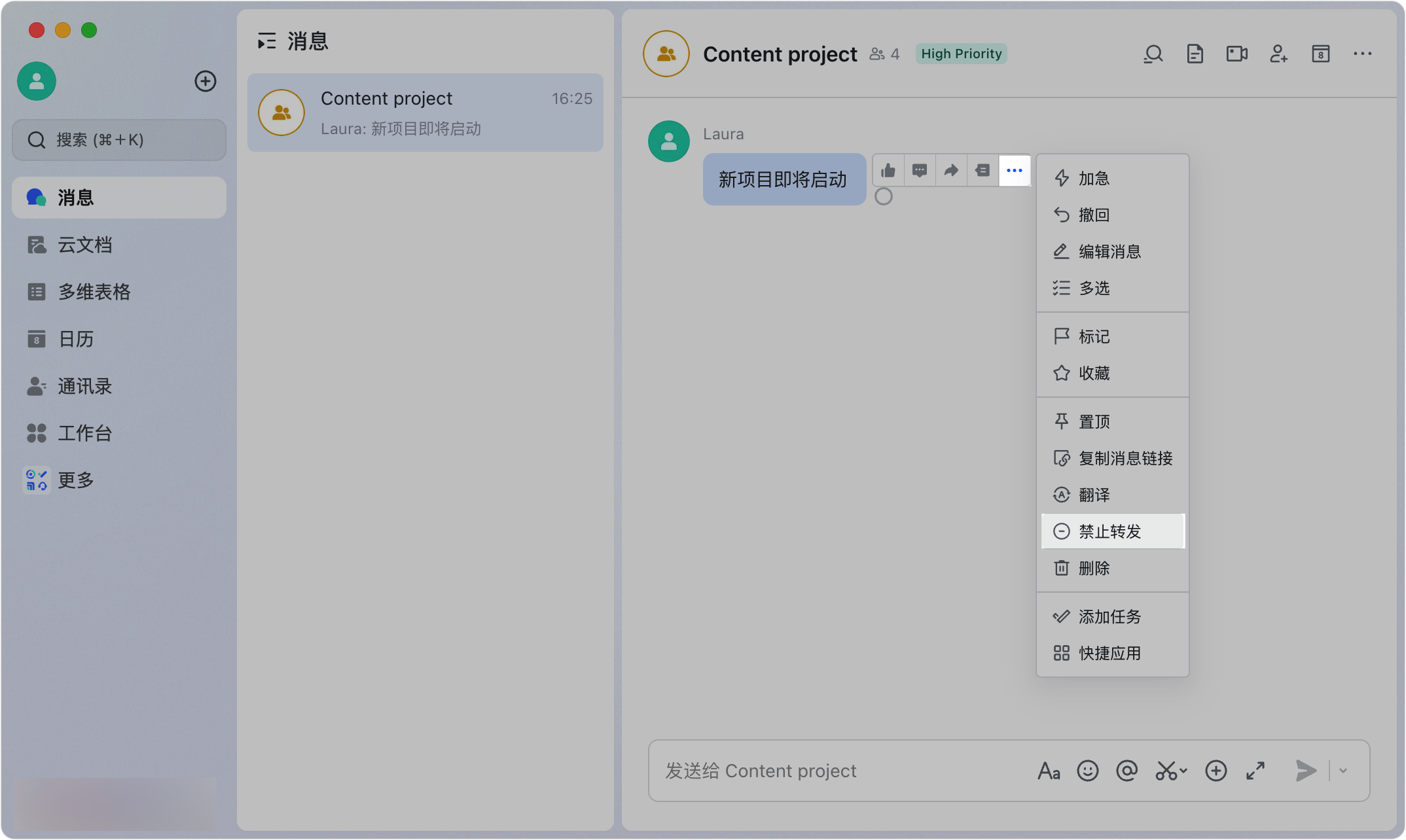 - 单条消息管控: 哪怕只是一句话,你也可以对该消息设置 “禁止转发”,防止它流出当前会话。
