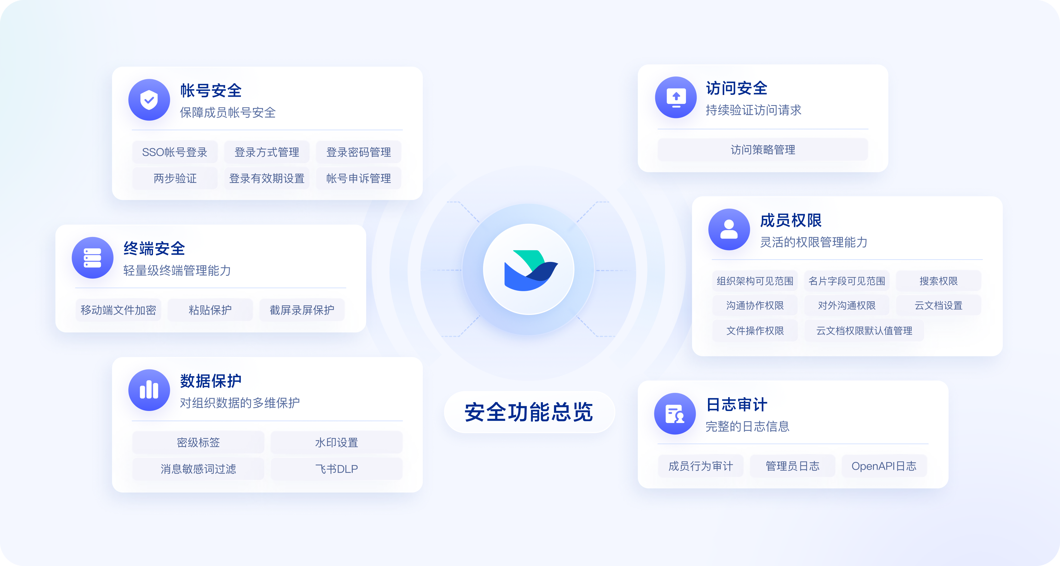 作为一站式企业协作平台,飞书能够提供帐号安全、访问安全、成员权限、数据保护、终端安全、日志审计等多方面的安全管理能力。帮助企业管理员落地企业安全制度规范,建立起和组织成员间的信任关系。