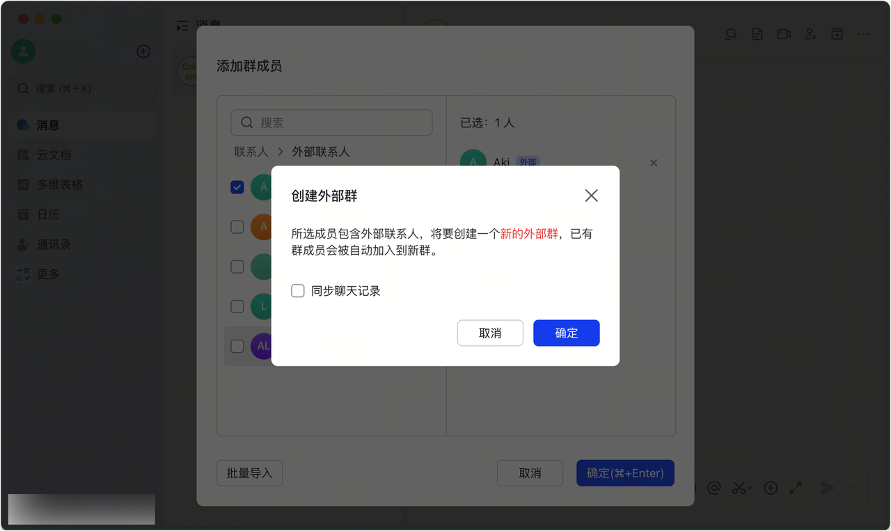 - 自动建群: 外部人员不能加入内部群,当你在内部群拉入外部人员时,自动创建外部群,保障内部对话不泄露。