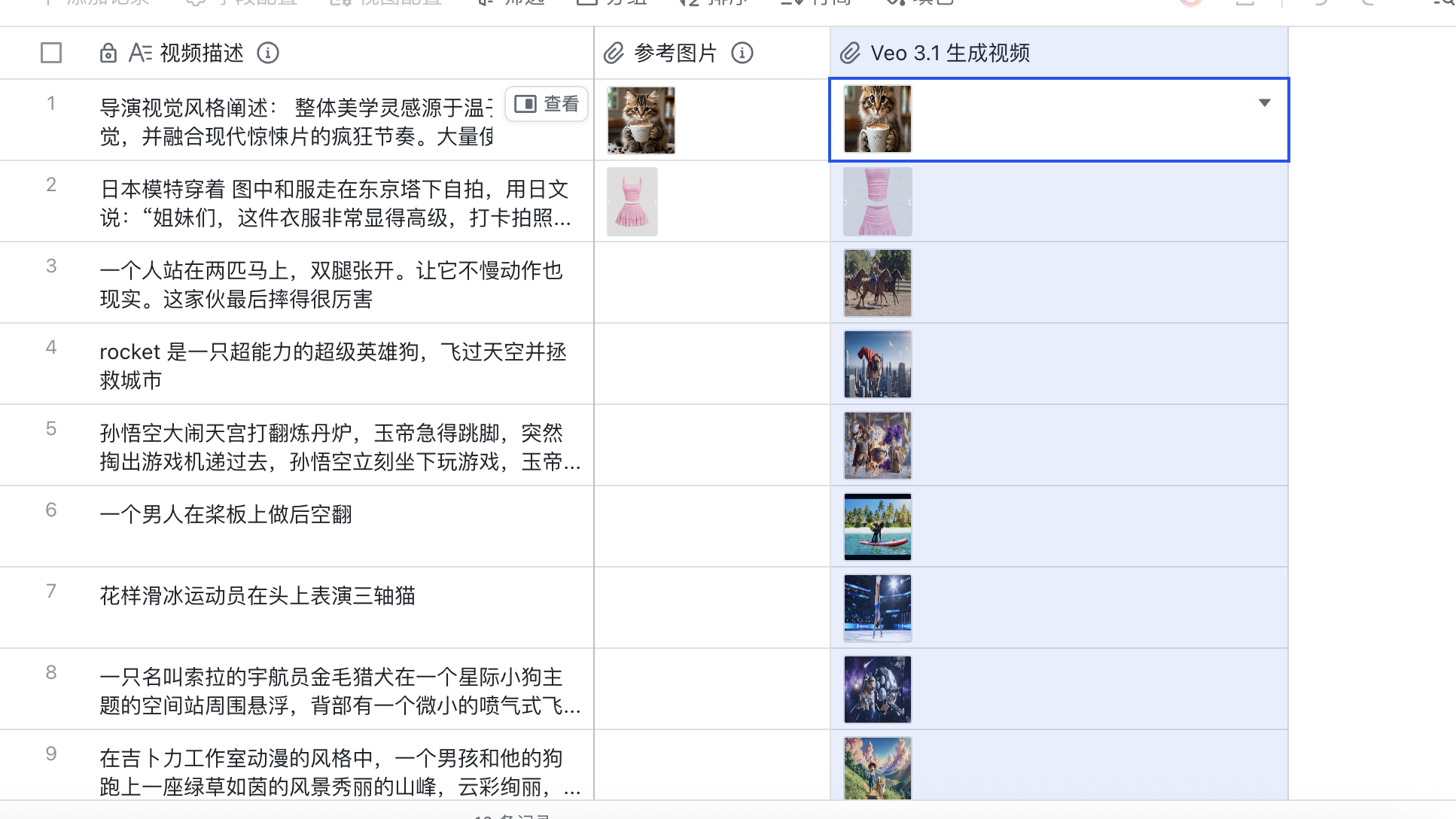 如果说生图是静态的艺术,那生视频就是动态的魔法。多维表格接入了 Sora 2、Veo 3.1、Vidu Q2 等前沿模型,实现了从“视频生成”到“演技生成”的跨越。