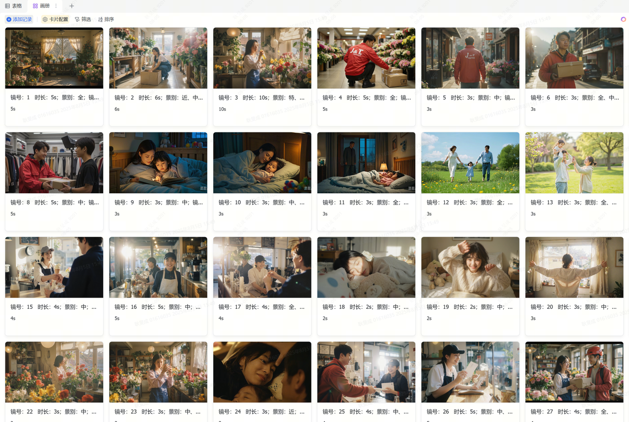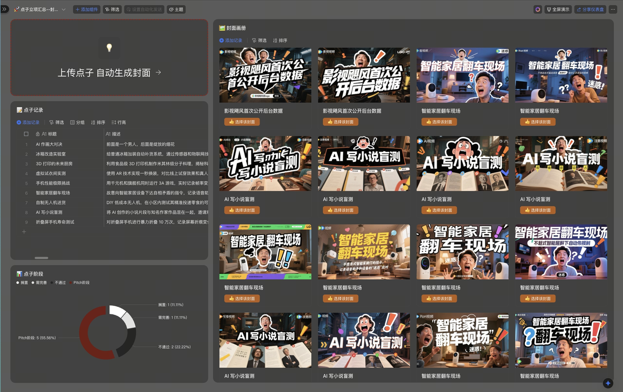 只需要输入视频内容的构思文案,多维表格内置的 AI 字段就会自动根据文字生成近二十张的视频封面参考图。这对项目建立初期具备非常强的参考价值,便于探讨视频预设效果并决定是否立项。