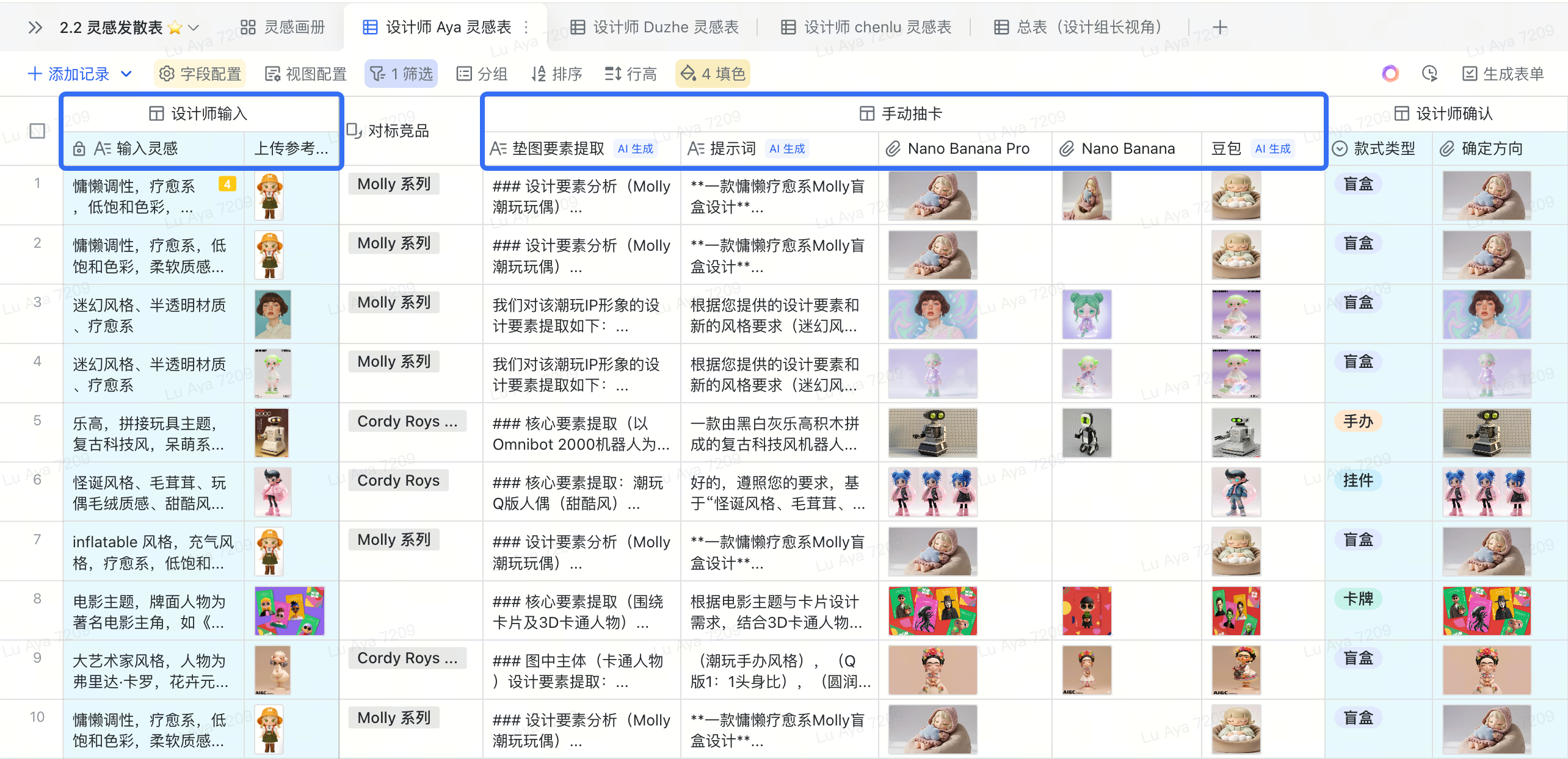 - 同一创意多工具抽卡 :在系统表格中体验,运行时间约 3~6 分钟,生图成功会有飞书消息通知。系统可以根据 IP 类别分别进行生图(盲盒/卡牌/手办/玩具),AI Agent 节点确定该分支下所有图片的内容、规格,并输出多段提示词。