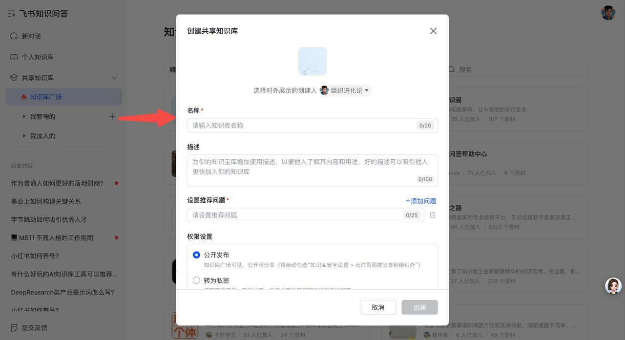 - 操作入口:点击“+”号或者“创建知识库”,选择对外展示的创建人身份。