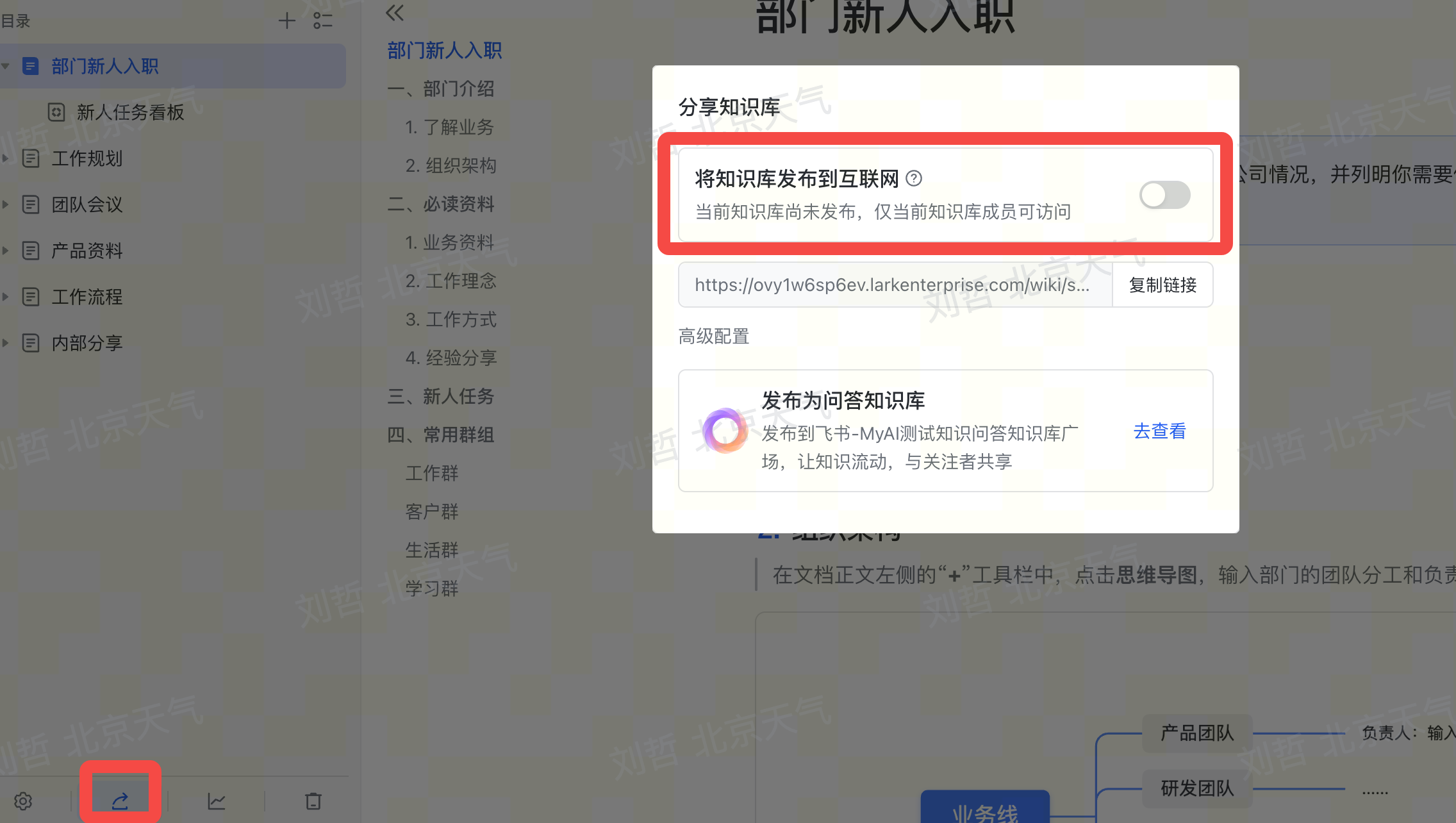 ⚠️注意:开启此功能时,请确保关闭“将知识库发布到互联网”开关,防止内容泄露。