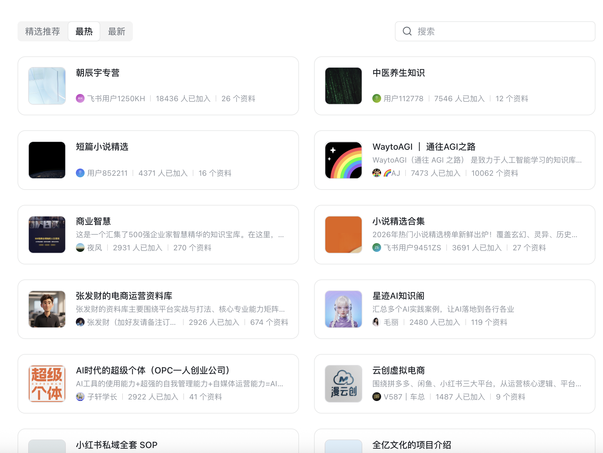更重要的是,飞书AI知识库新增了「共享知识库」功能,就像是一个开放的“知识超市”,不需要费力去收集资料、整理文档,飞书的“知识库广场”里汇聚了各行各业大神整理好的资料库。