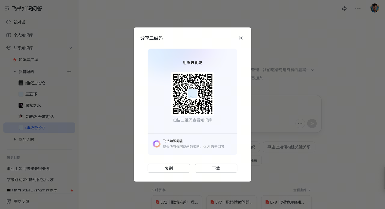 知识问答「共享知识库」支持企业和内容创作者将知识库发布为可 AI 问答的 AI 知识库,实现企业资源发布或内容变现。