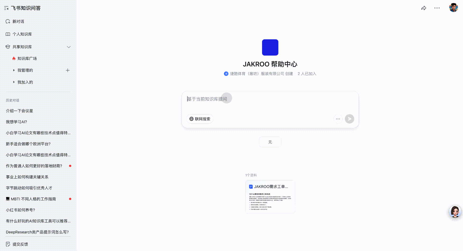 飞书 AI 知识库是飞书知识问答推出的 AI +知识库能力,为你的飞书知识库配备可任意问答的 AI,帮助读者更好的了解知识库中的内容,并支持全网发布。