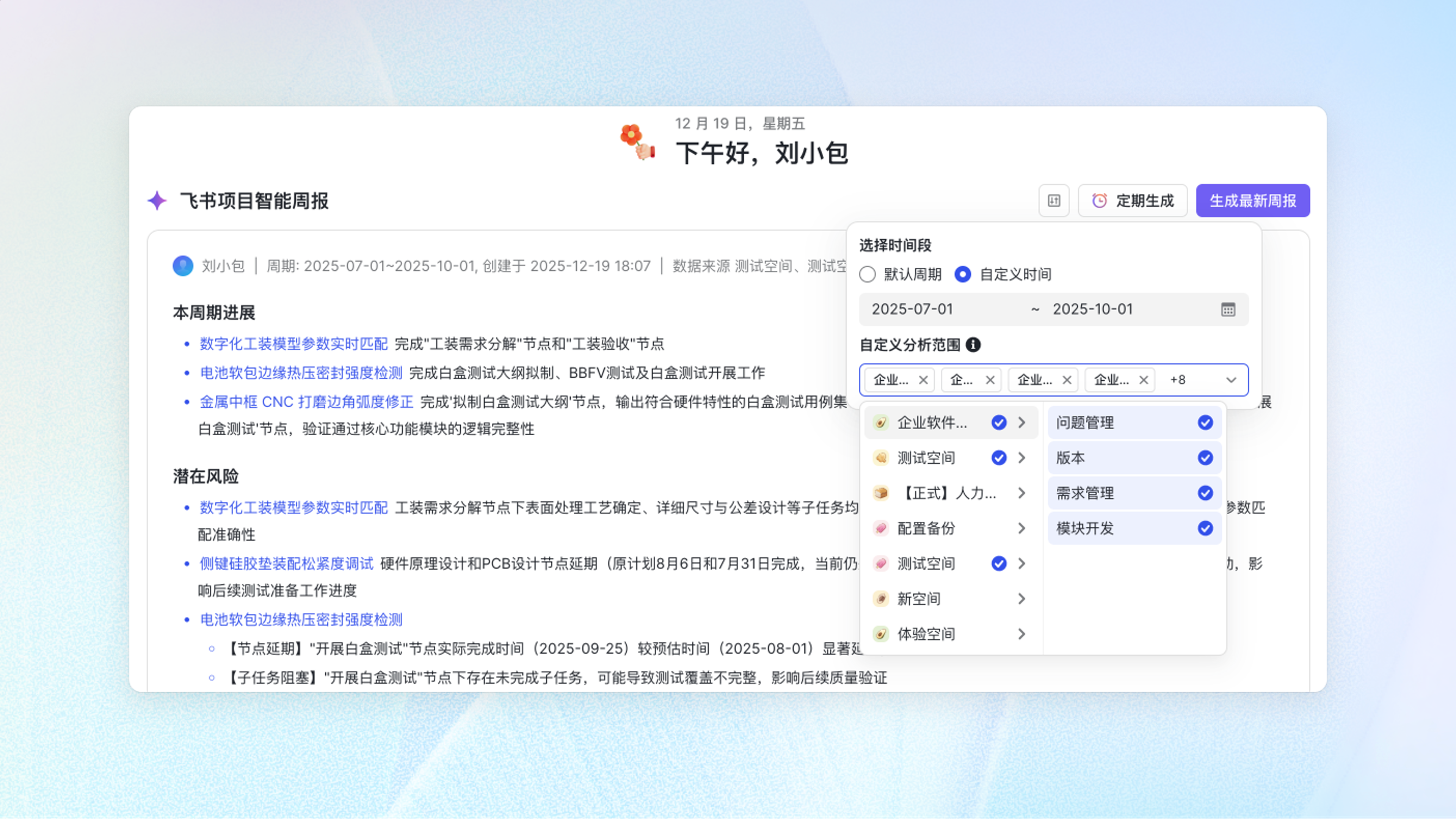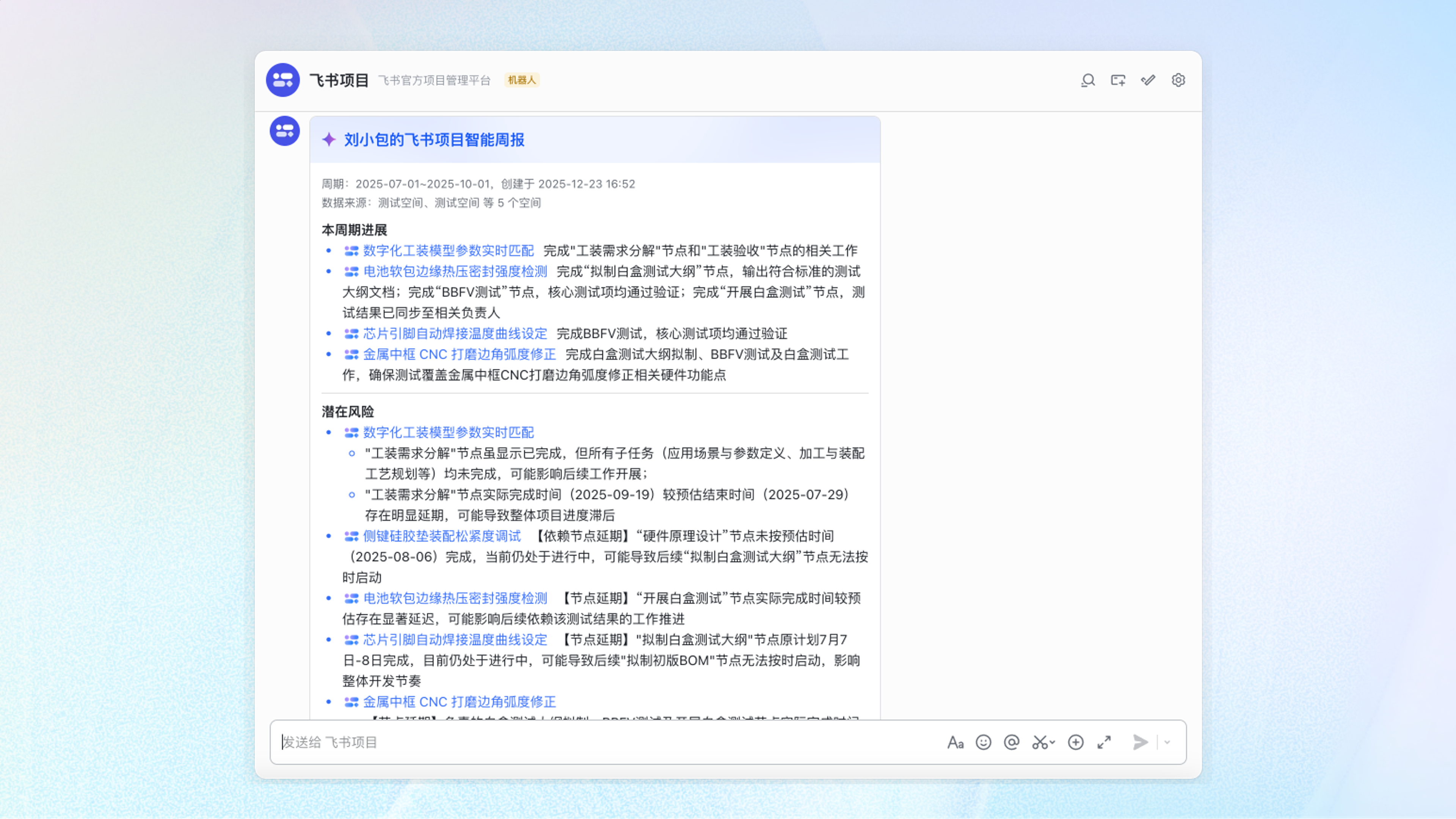 辅助周报撰写,一键生成初稿:你不再需要手动查找数据。在周会汇报前,只需设置分析时间段与范围,AI 即可智能连接飞书项目、文档及项目群聊信息。