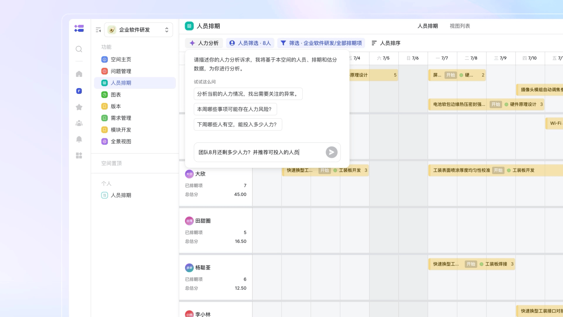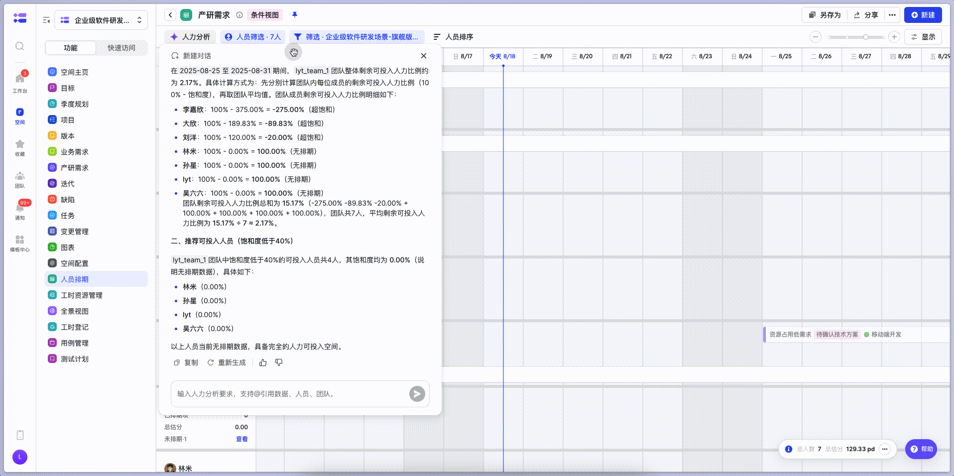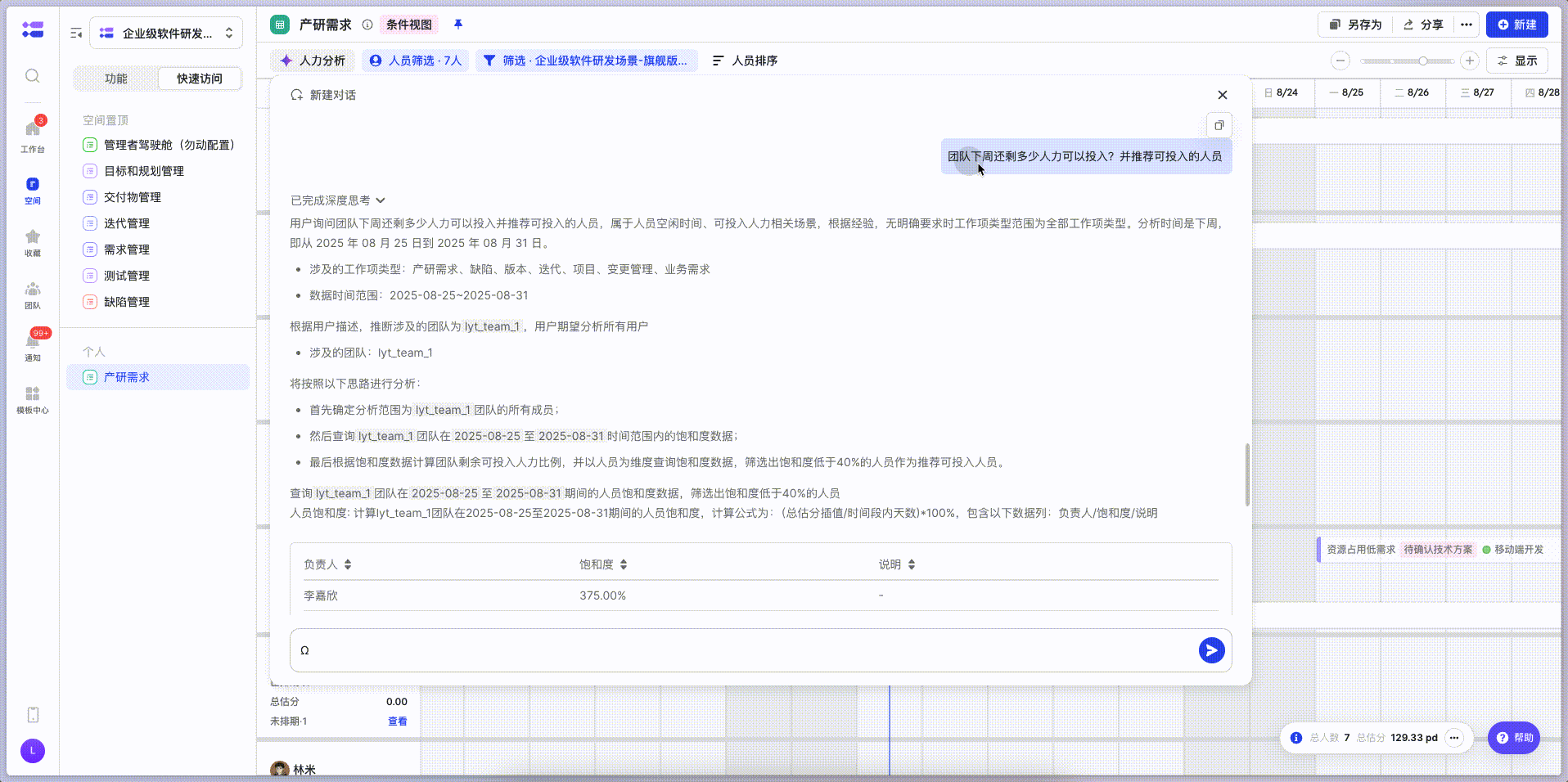 - 无需复杂的数据整理,在对话框中像聊天一样提问(例如:“团队8月还剩多少人力?”),AI将立即分析排期数据并生成结果,并自动推荐可投入人员。