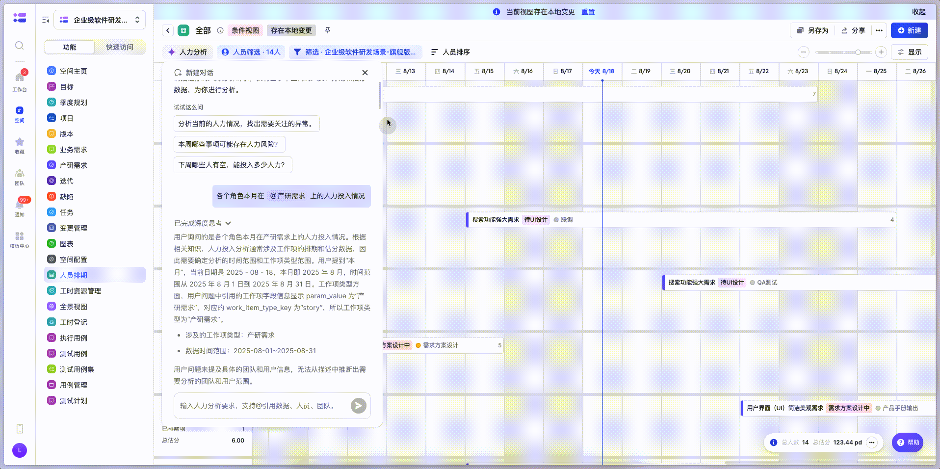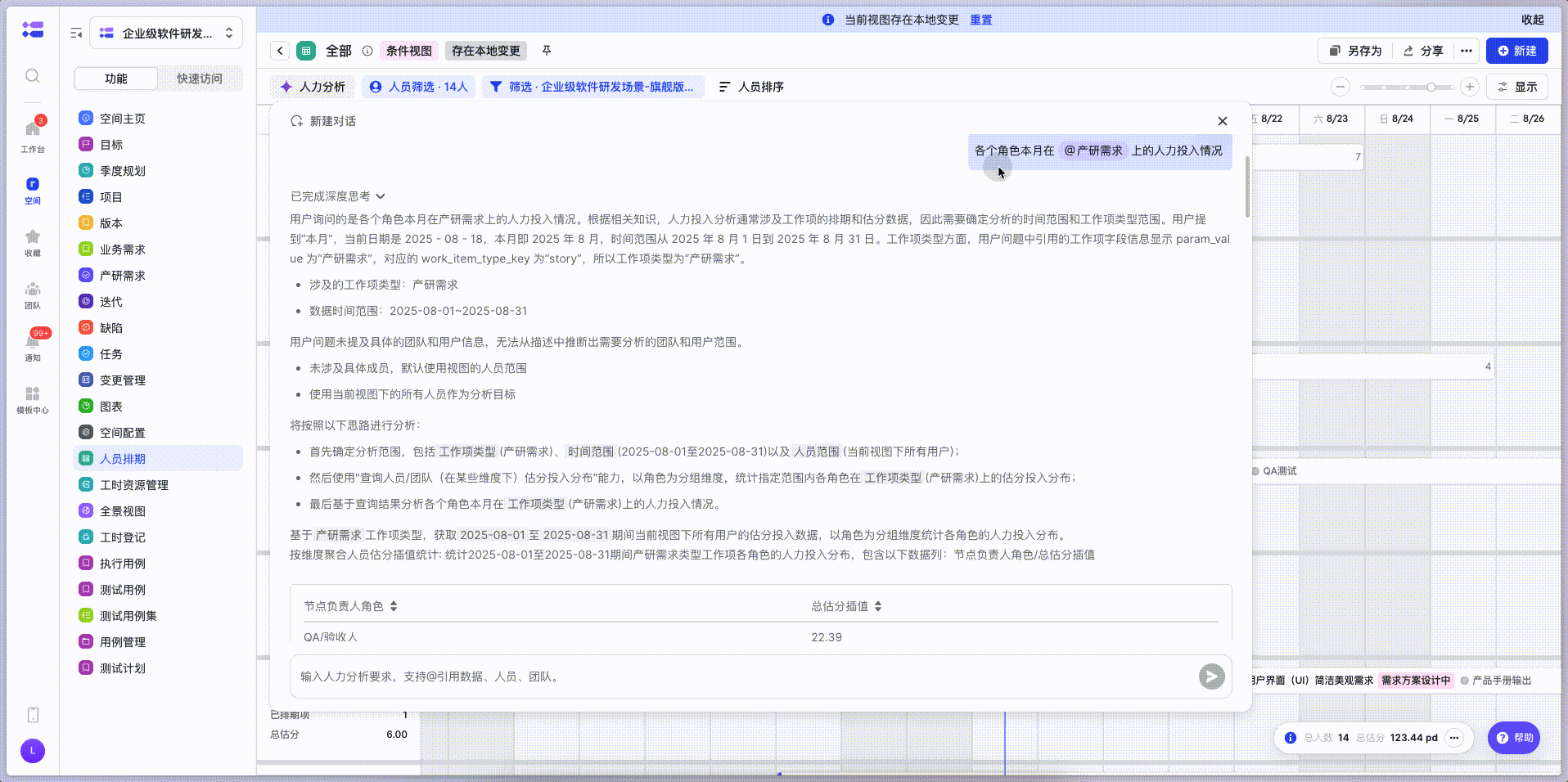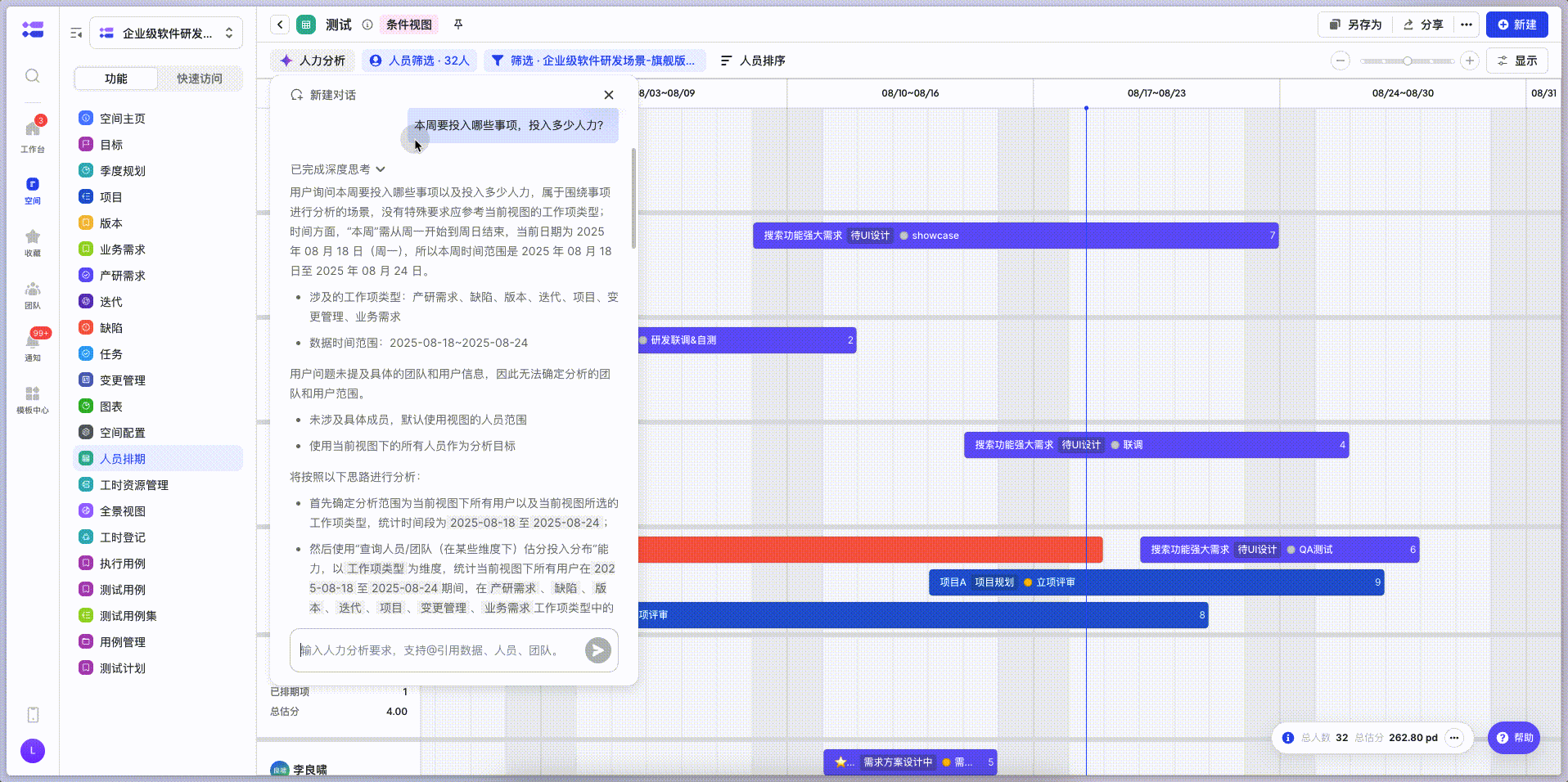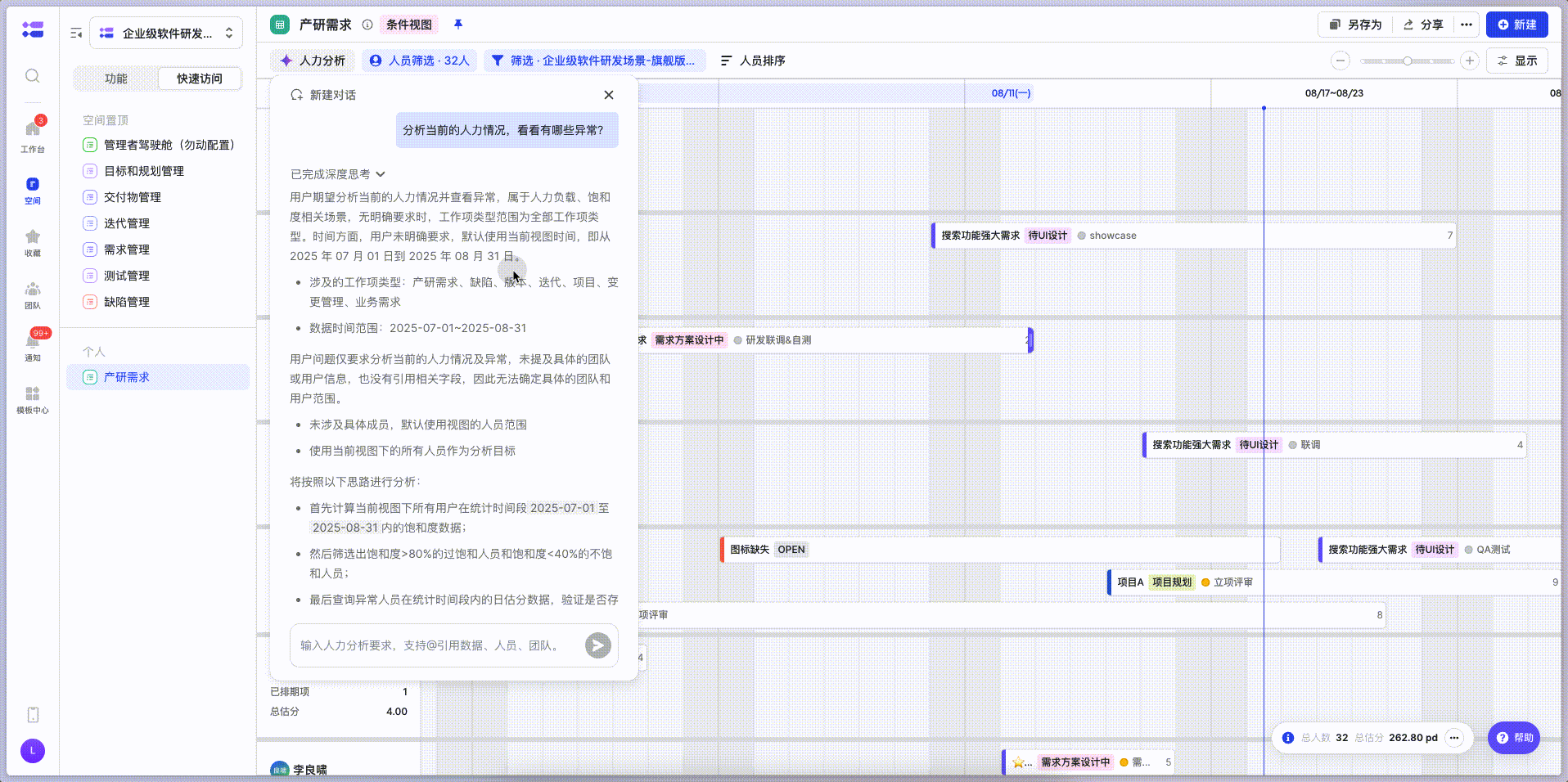 - 无需复杂的数据整理,在对话框中像聊天一样提问(例如:“团队8月还剩多少人力?”),AI将立即分析排期数据并生成结果,并自动推荐可投入人员。