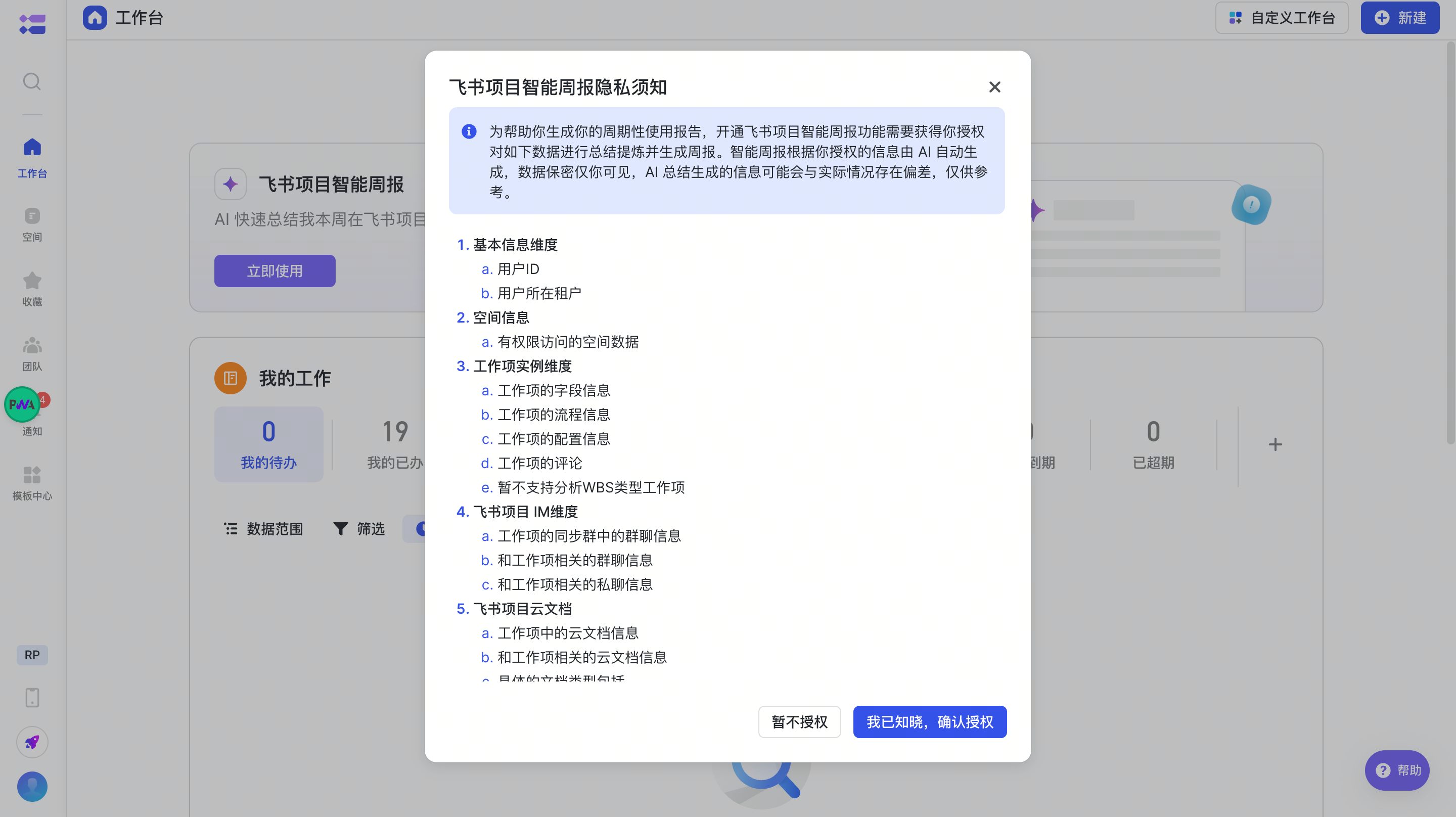初次使用 AI 周报功能,系统会向您进行数据授权申请,具体授权信息参考下述页面介绍。如果您选择【暂不授权】,系统会展示【立即使用】入口,直至授权后才可使用 AI 周报功能。