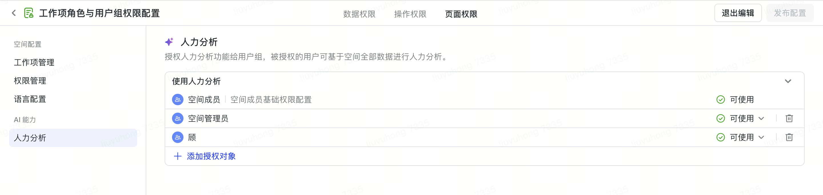 支持给特定用户组开放或收回人力分析功能的使用权限。支持在【空间配置 - 权限管理 - 工作项角色与用户组权限配置 - 页面权限 - 人力分析】路径下,配置特定用户组的人力分析权限。