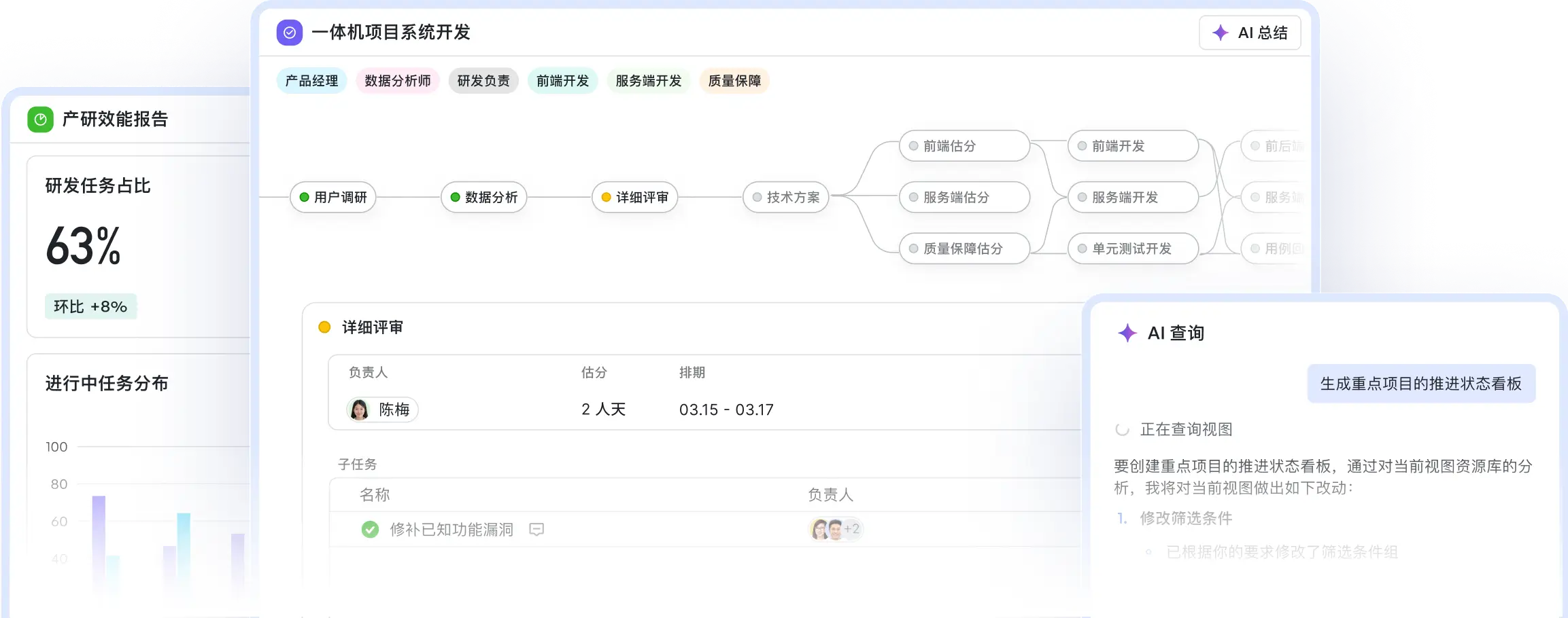 针对复杂场景的专业项目管理平台,飞书项目一直致力于通过标准化流程加速项目上线,今天我们就来介绍飞书项目最近上新的两大AI功能:「AI个人周报」与「AI人力分析」。