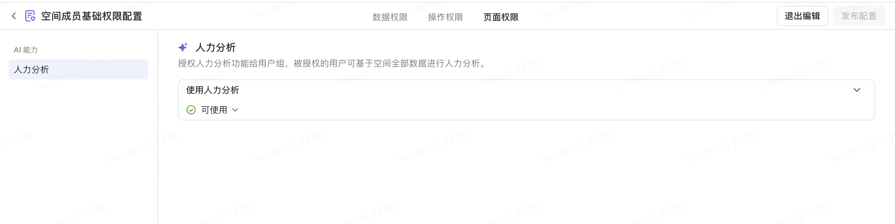 空间全部成员默认具备功能权限。支持在【空间配置 - 权限管理 - 空间成员基础权限配置 - 页面权限 - 人力分析】路径下,修改空间成员人力分析权限的配置。