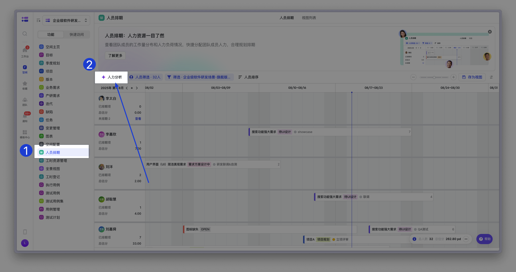 人员排期视图:人员排期→视图列表→具体视图→人力分析