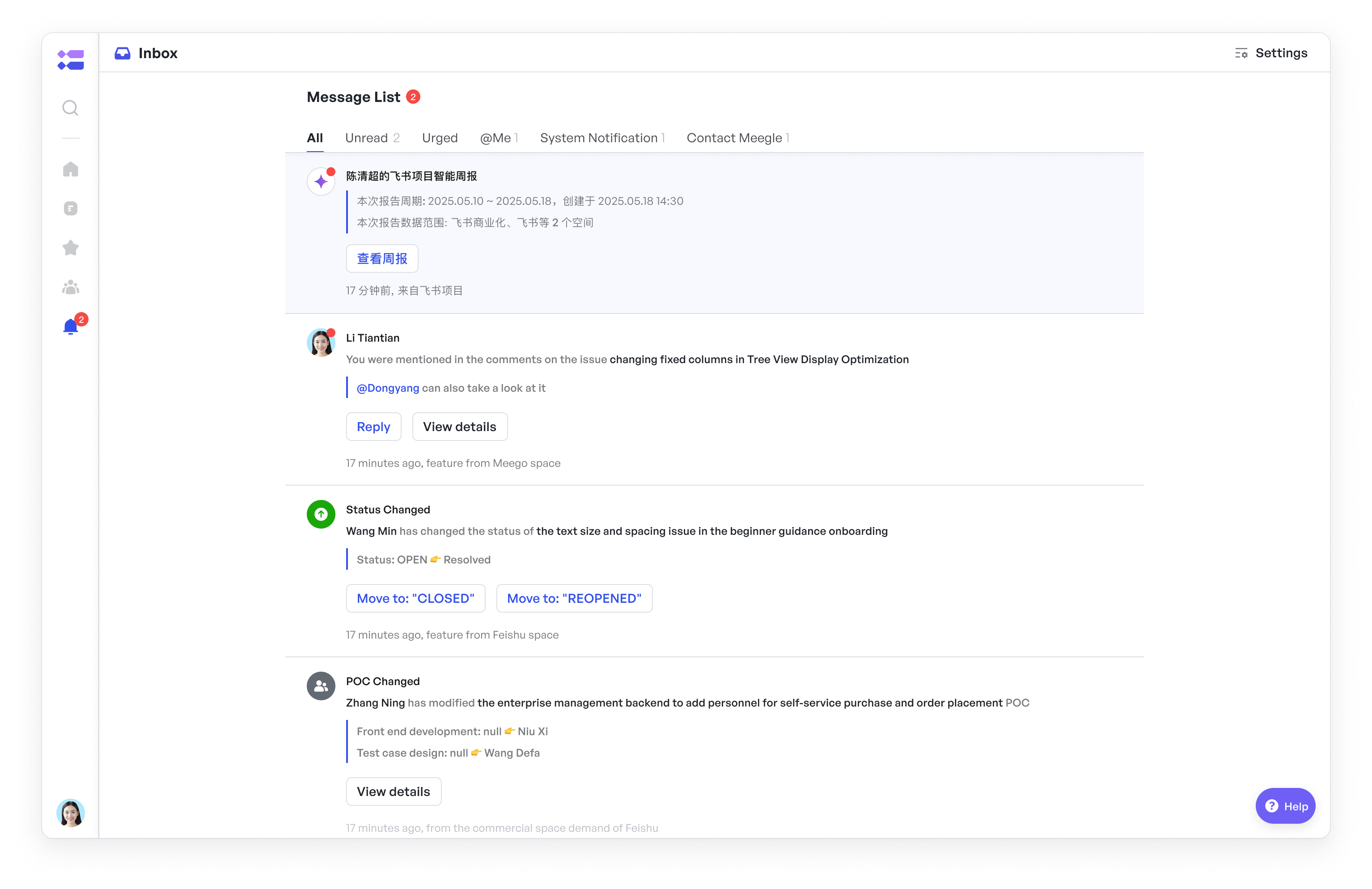 - 飞书项目通知:飞书项目通知中心也会收到一条通知,点击即可快速跳转回周报页面。