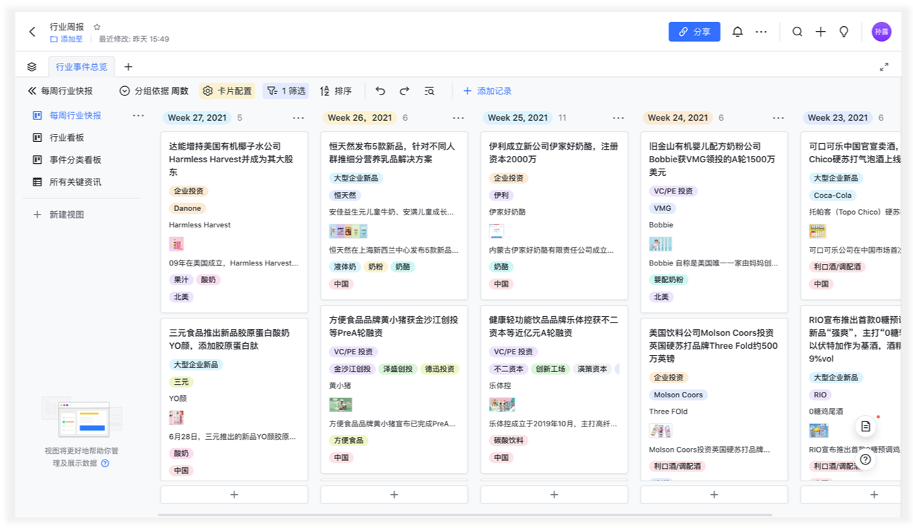 - 多维表格做行业资讯的收集:可生成不同的看板,一目了然