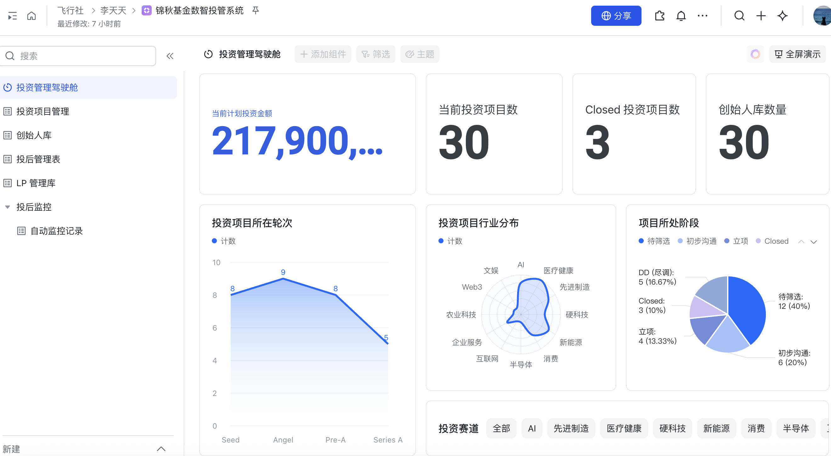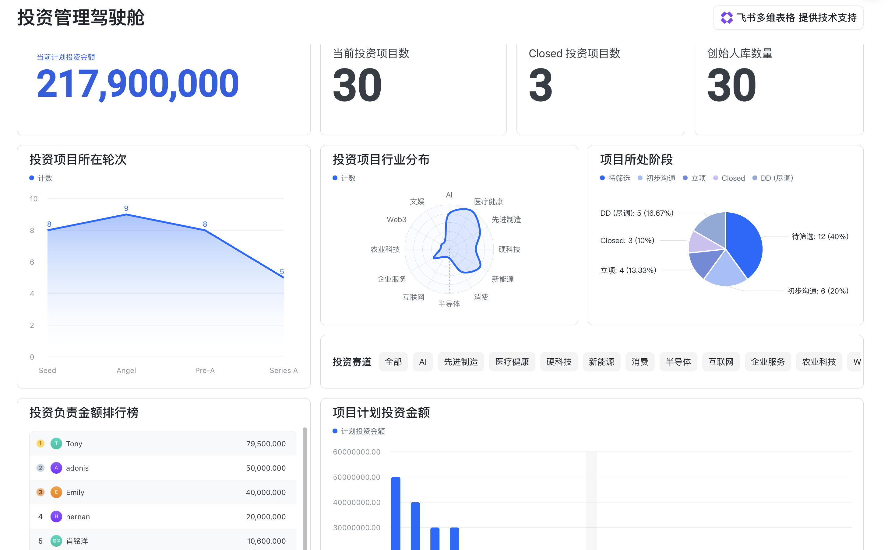 多维表格内置强大的仪表盘组件,导出导出数据做PPT,直接生成柱状图、饼图、折线图。管理者打开手机,可以看到投资组合的实时表现、行业分布和城市分布。