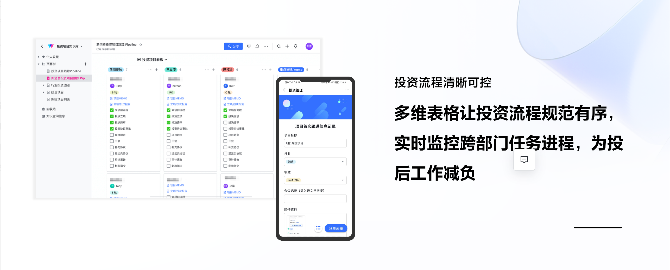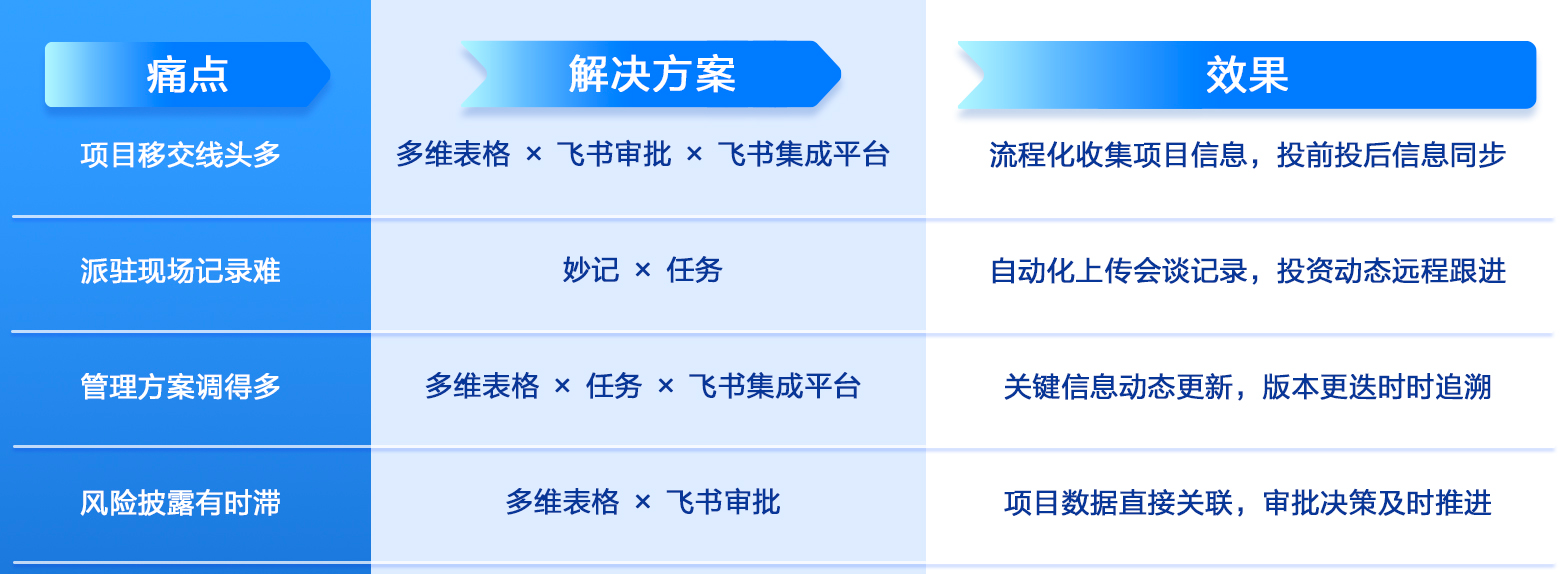 痛点:项目从投前团队移交到投后部门,投资标的信息维护权责不清晰,维护需要额外工作量。且项目现场和中后台的信息线头多、维护成本高,这进一步增加了项目风险跟进不及时、业绩关键信息不同步的风险。