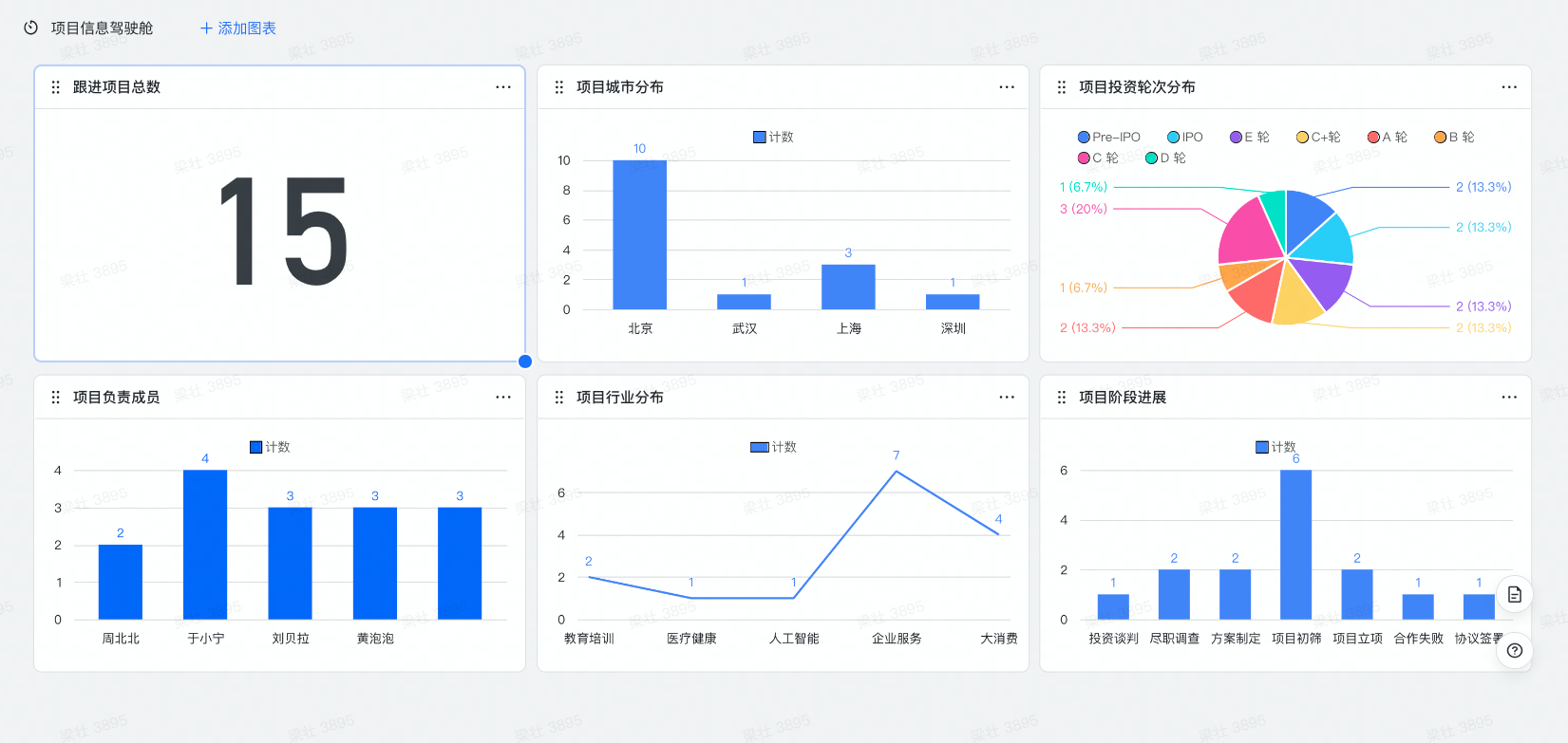 - 搭建项目信息驾驶舱,图表自主分析数据,项目转化率,项目行业分布,项目城市及投资轮次等,直观展示