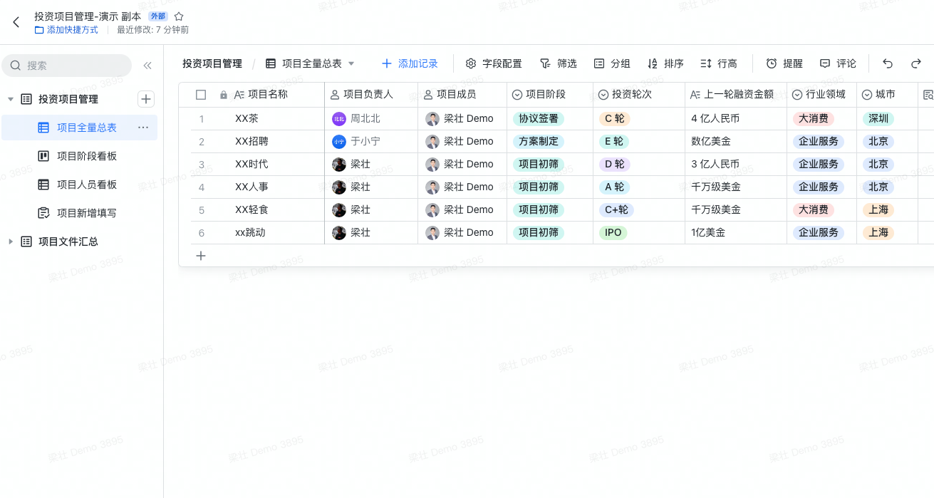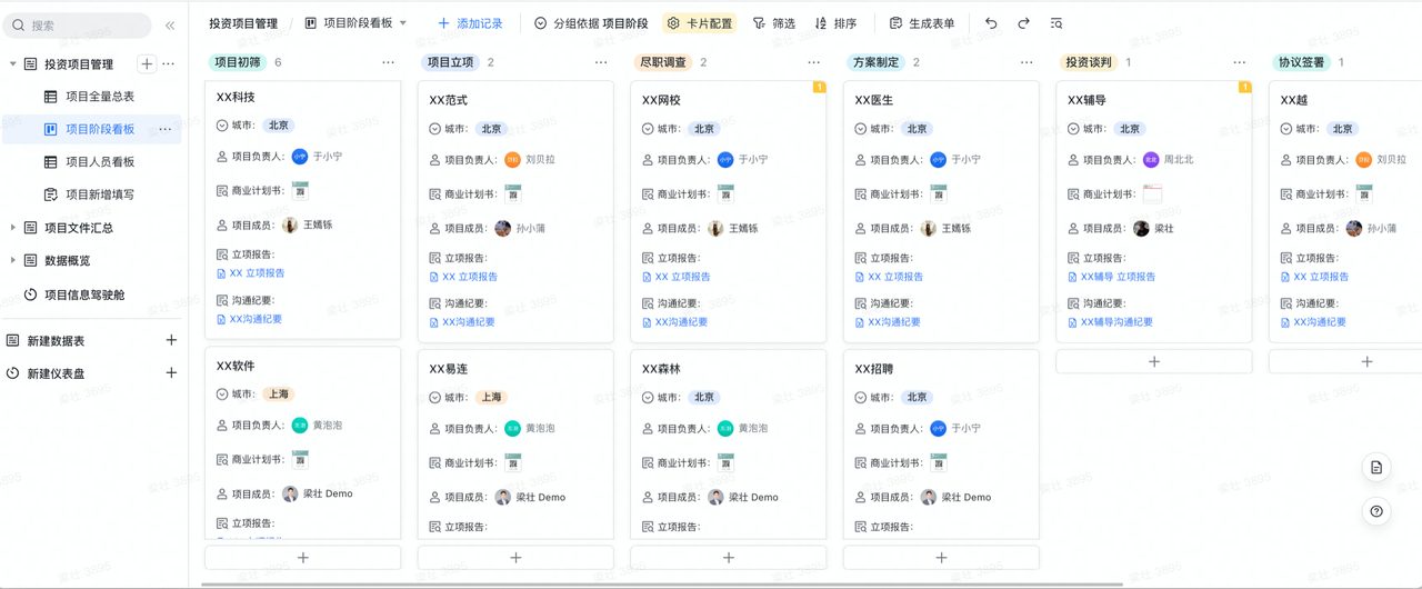 - 实时监控:项目数据直接关联,审批决策及时推进。风控团队可以在多维表格内对投资项目进行经常性分析检查,了解、掌握其运营情况,对投资项目实施动态监控。