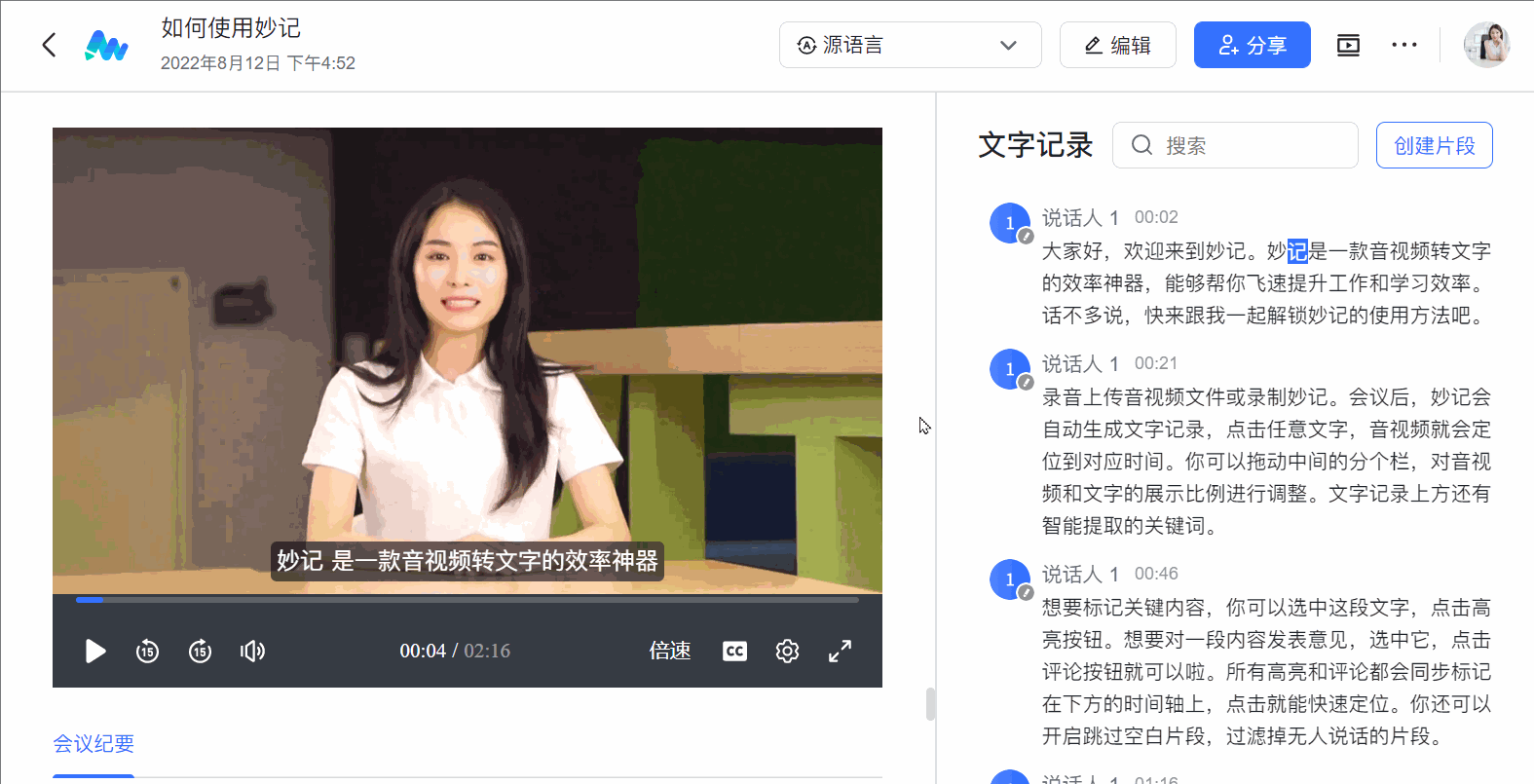 - 妙记自动记录:在现场访谈、调研时,直接用飞书妙记录音,自动转文字,智能提取关键信息。中后台团队随时随地可回溯溯源会议焦点。