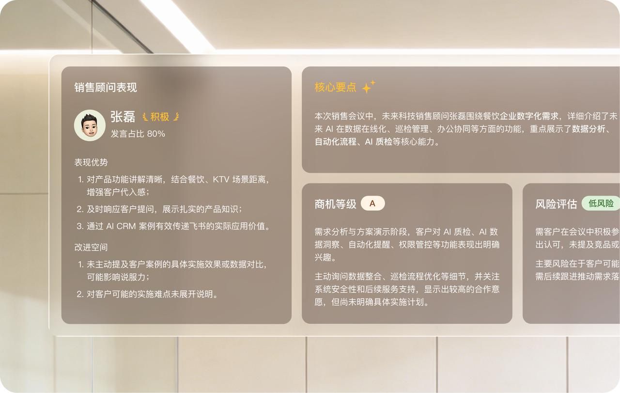 在员工授权的前提下,企业可以汇总团队录音,通过 AI 按既定规则进行分析,生成个人质检报告和改进建议。培训不再只靠经验传授,而是形成“记录—分析—反馈—改进”的完整闭环。