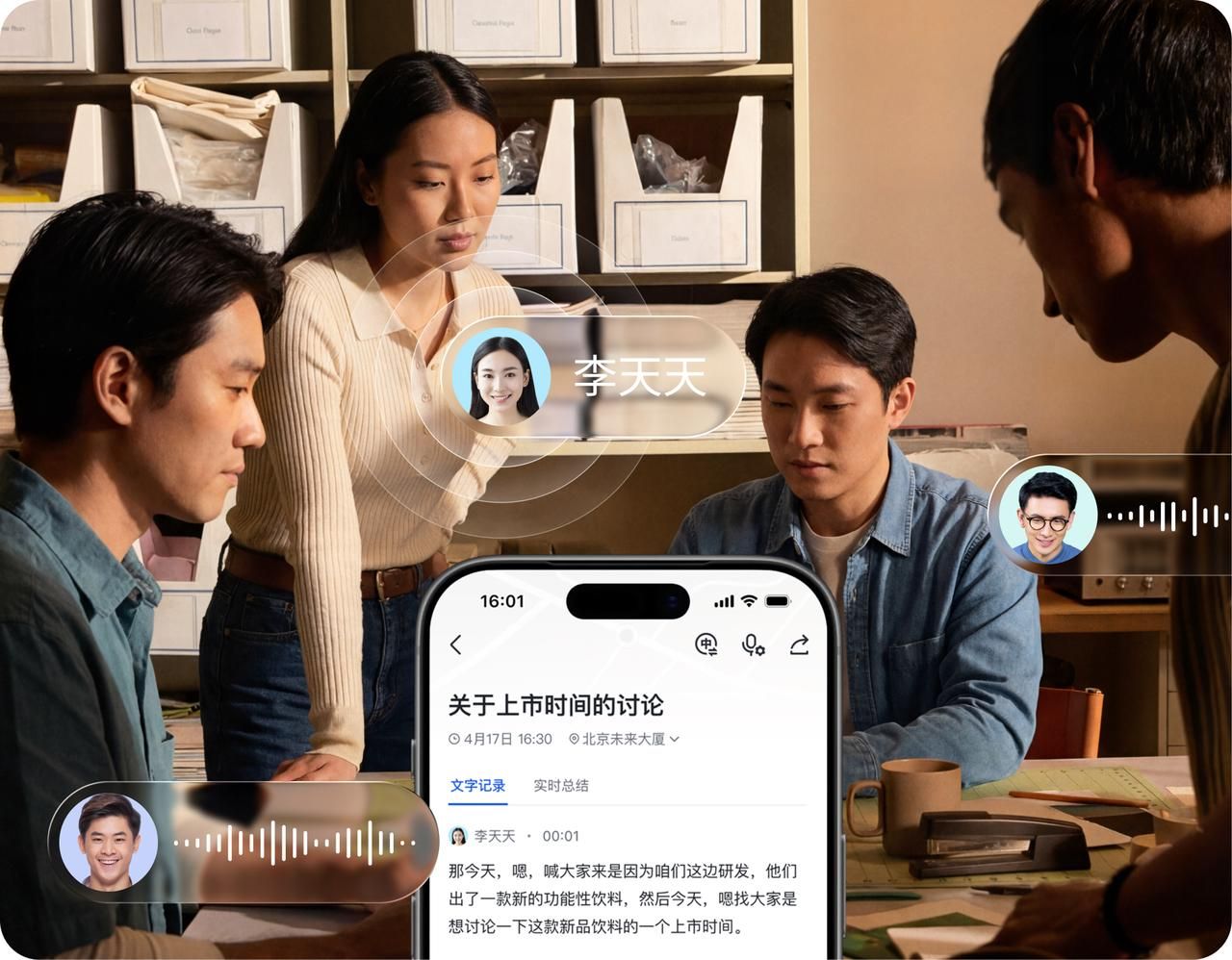 依托飞书 AI 核心技术,产品在录音过程中即可实现实时语音转文字、发言人区分和可视化 AI 总结,相当于为每一场会议配备了一位实时工作的 AI 会议助理。