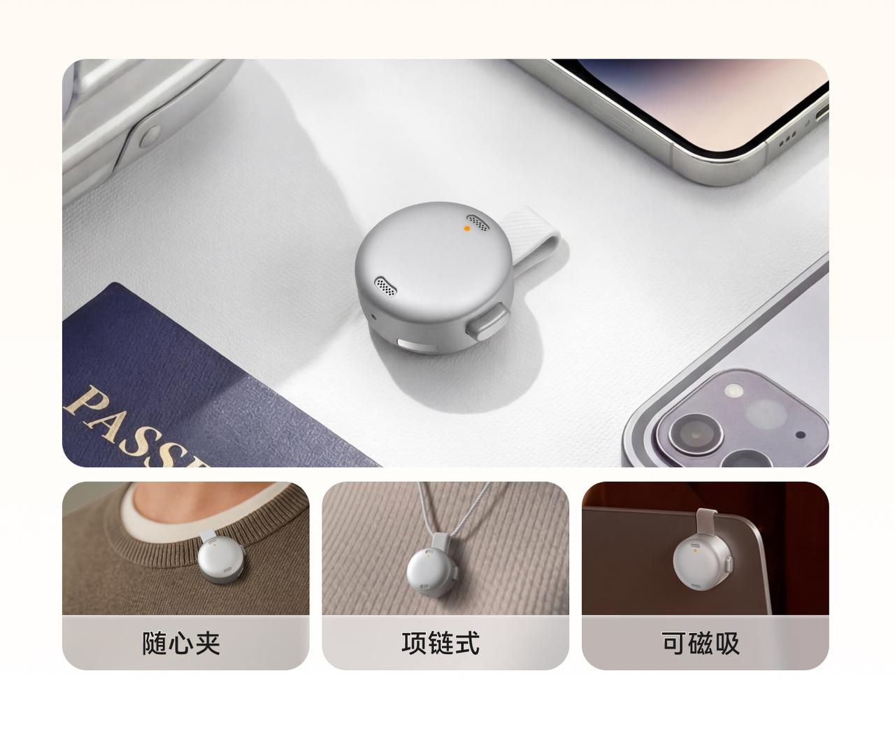 产品机身直径仅 23.2 毫米,单体重量约 10 克,是同类产品中极为小巧的形态。支持领夹、挂坠、背板磁吸等多种佩戴方式,无需占用手机背面,也不必刻意手持或放入口袋,在会议、访谈等正式场景中更加隐蔽自然。