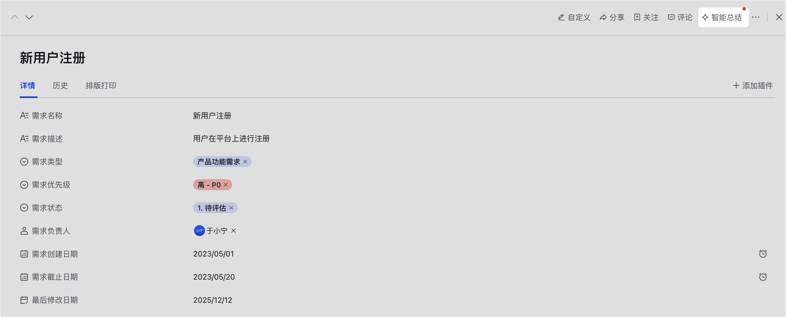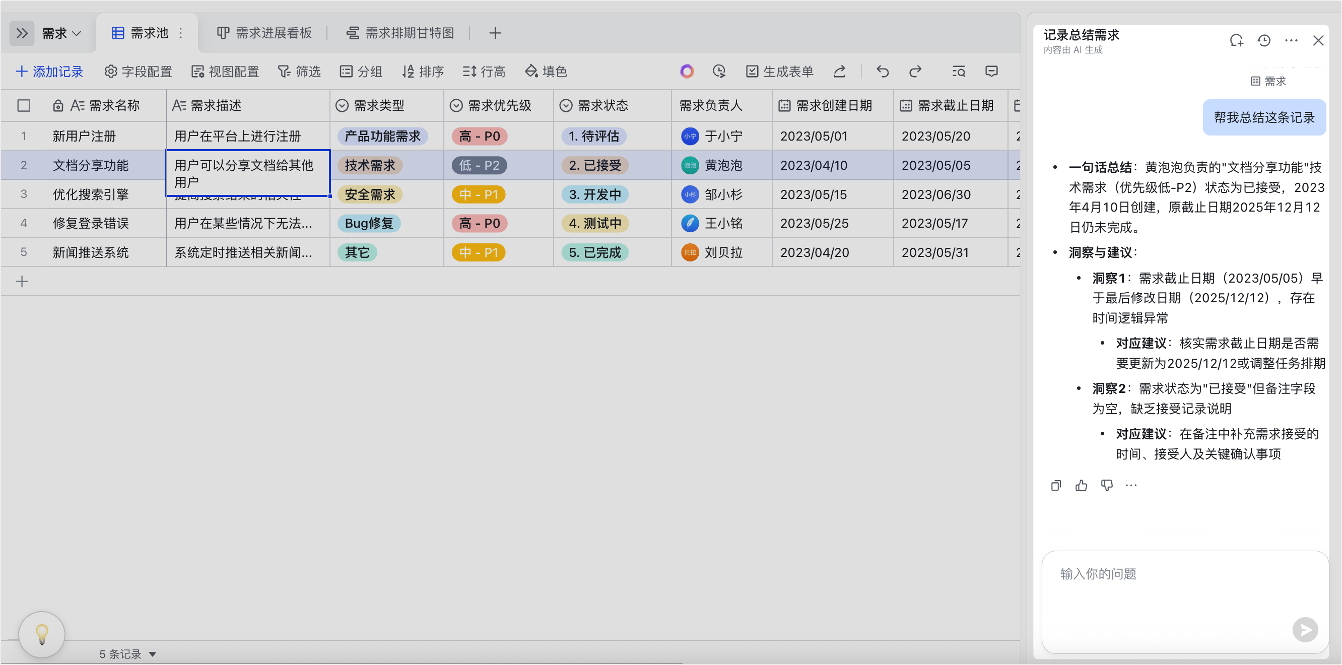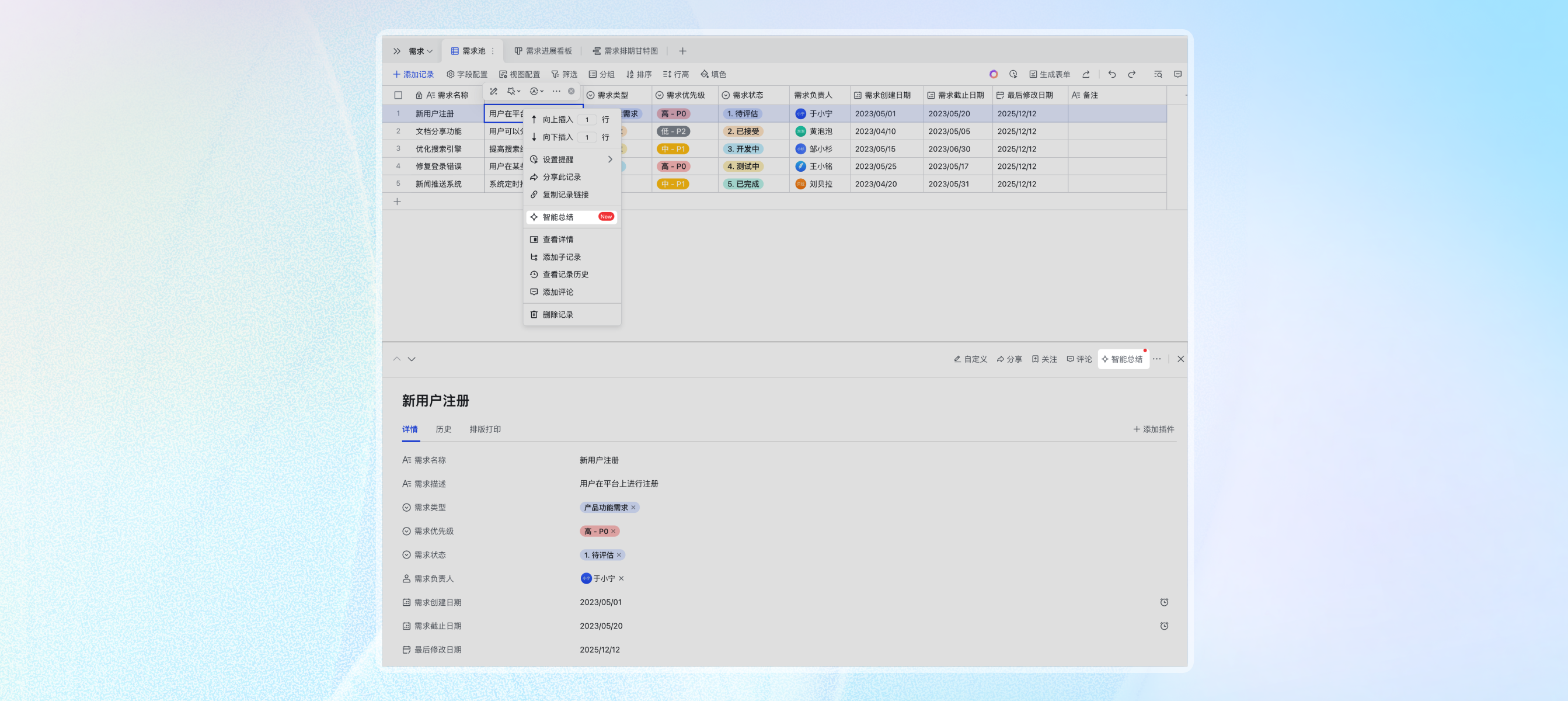 以前查看一条复杂的记录(比如一条长长的用户反馈或复杂的项目需求),需要一行行去读字段。而现在,AI可以帮你读了!