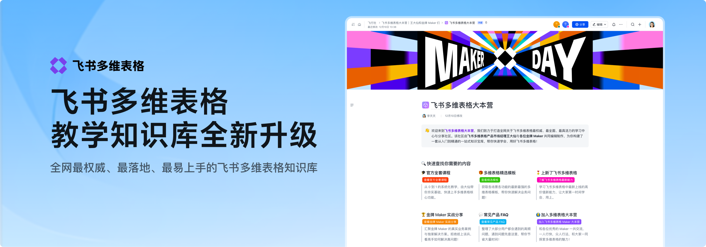 担心不会用多维表格?别怕!全网最权威、最落地、最易上手的飞书多维表格知识库与分享社区正式上线!该社区由飞书多维表格产品市场经理王大仙与各位金牌 Maker 共同编辑制作。为您准备了: