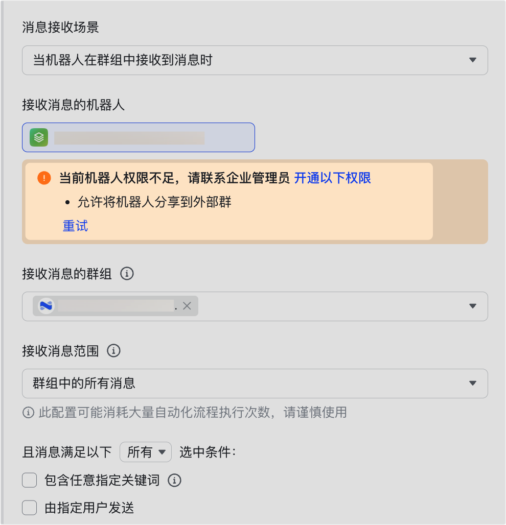 - 在自动化流程中设置“接收到飞书消息时”触发条件。在 接收消息的群组 中,添加用户群。注:你可以选择接收群内的所有消息或是仅接收提及机器人的消息。