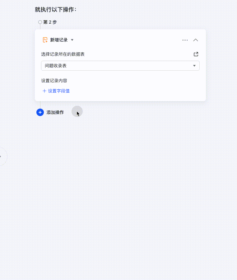- 设定动作:在 就执行以下操作: 中,选择 新增记录,并选择 问题收录表 作为要添加记录的数据表。