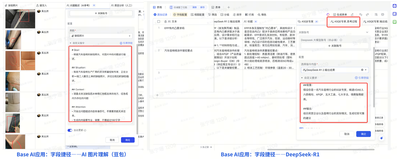 - 通过字段捷径+AI图片理解(豆包)自动识别一线上传的质量问题,辅助描述分析(准确率80%左右)