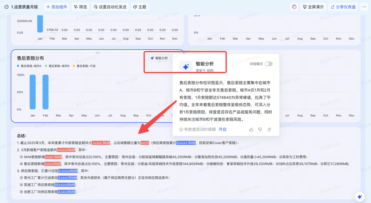 - 仪表盘更新自动推送+AI智能分析:替代传统Excel+PPT模式,支持数据实时更新与智能洞察推送