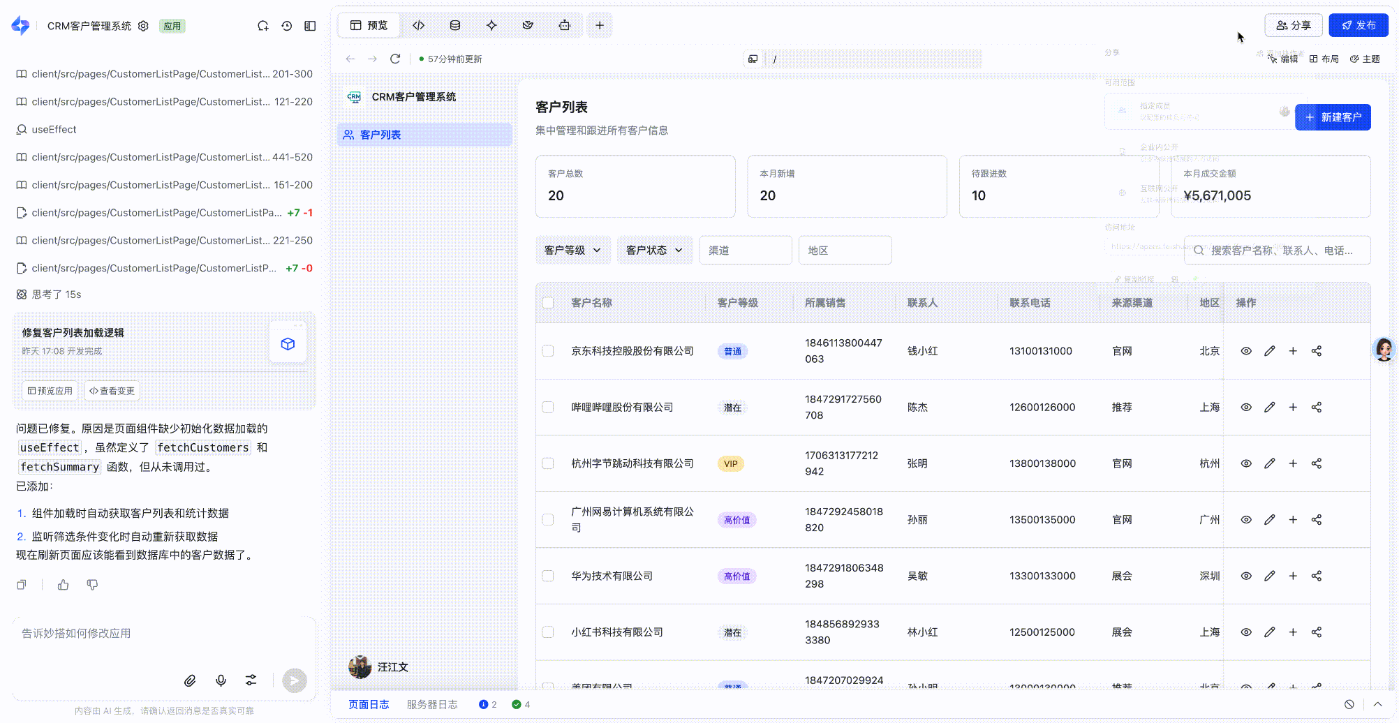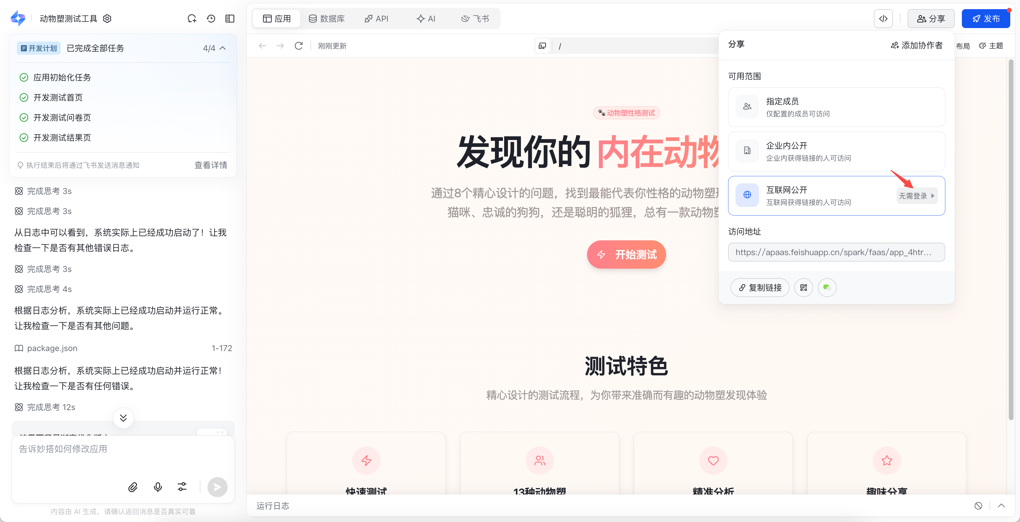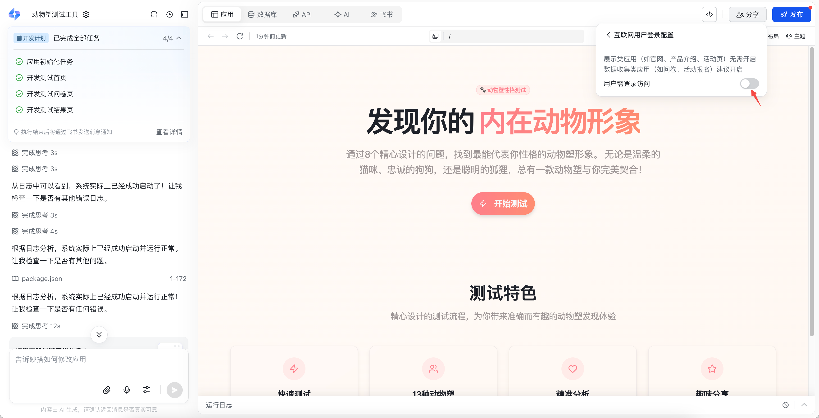 很多人误以为 AI 生成的代码只能做做演示,但飞书妙搭打破了这一刻板印象。它不仅能开发精美的网站、业务工具,做到“立等可取、所见即所得”,更能结合平台提供的基础服务,让系统真正上线使用。