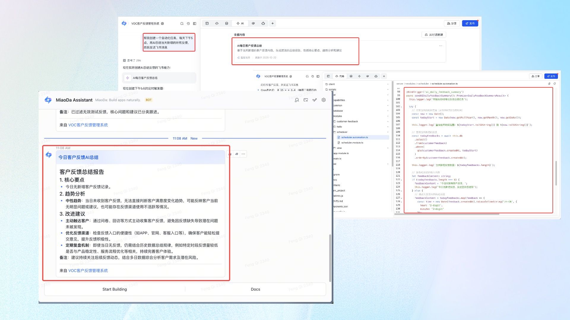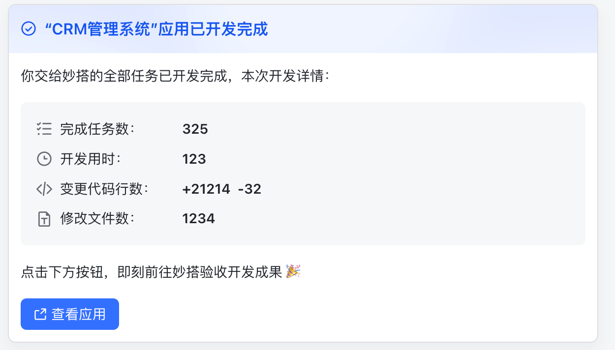 - 支持自动确认「开发计划」并执行任务,开发完成后即时通过飞书消息发送通知。使用「开发计划」模式开发完成后,系统将提供更清晰的执行结果概览,您只需要确认好需求,把开发任务交给妙搭,即可异步等待应用开发结果。