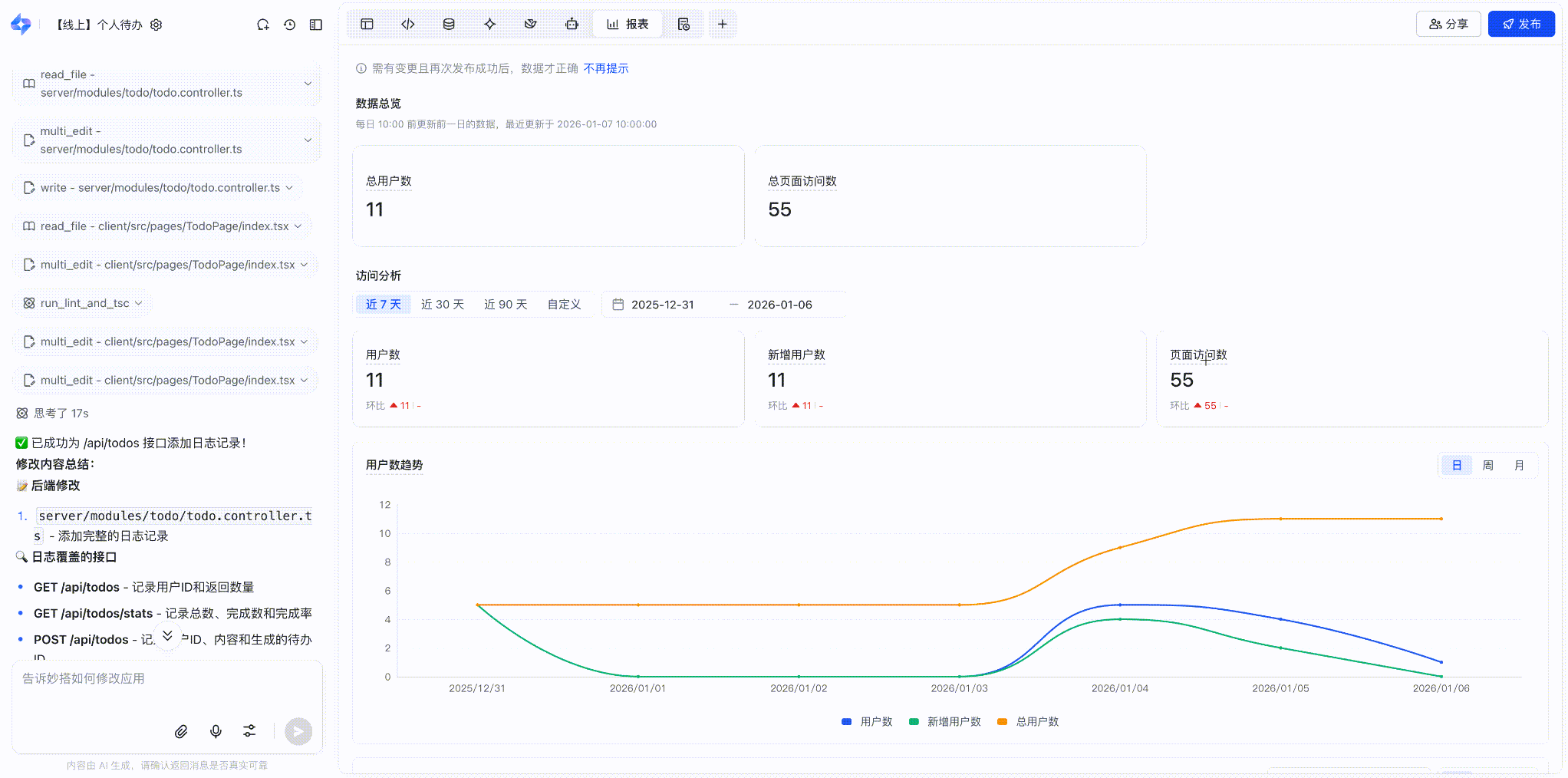 - 数据总览:总体展示应用的使用情况,包括总用户数、总页面访问数