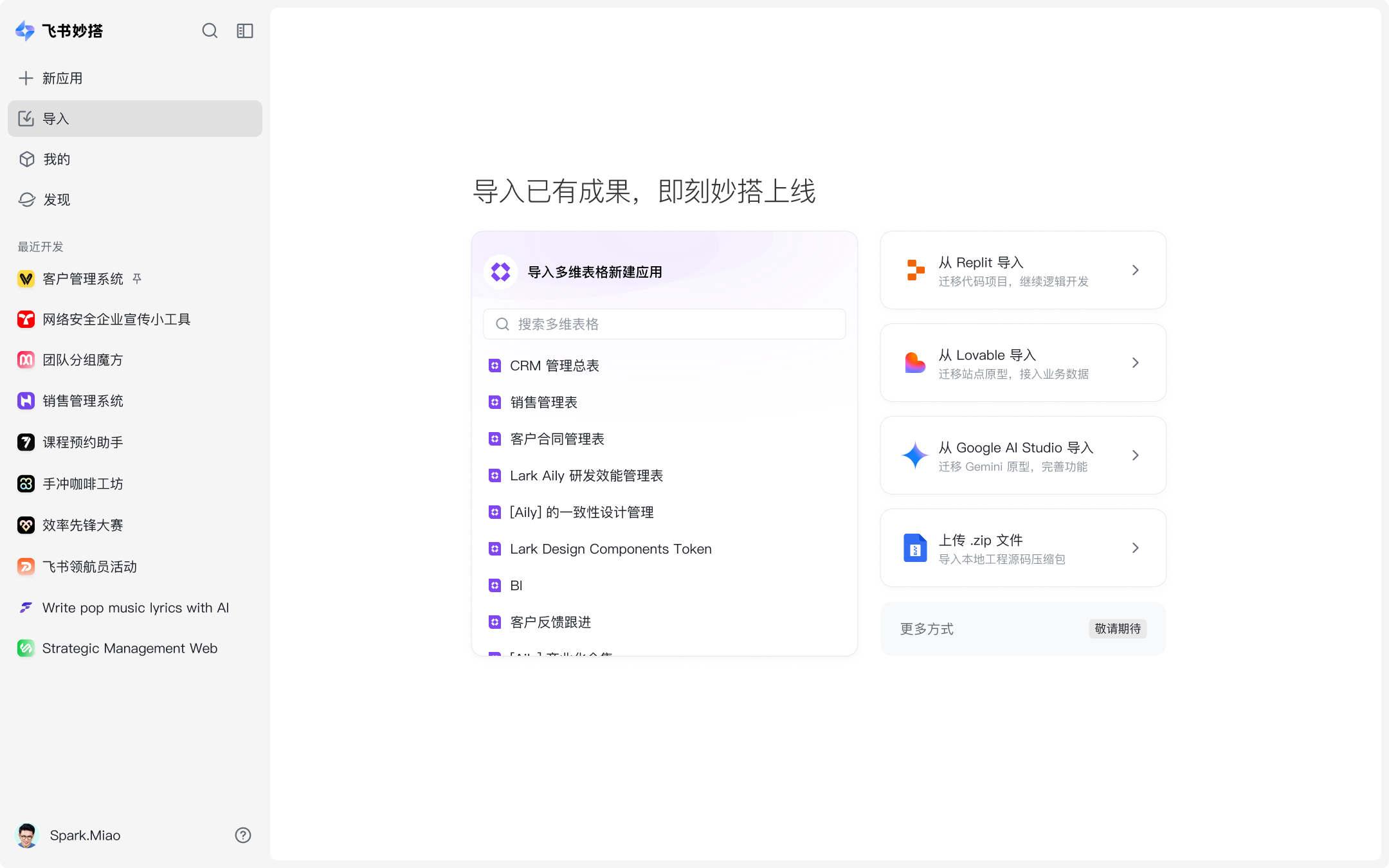 - 多平台支持:支持从飞书多维表格、Google AI Studio、Lovable、Replit 及 ZIP 压缩包导入