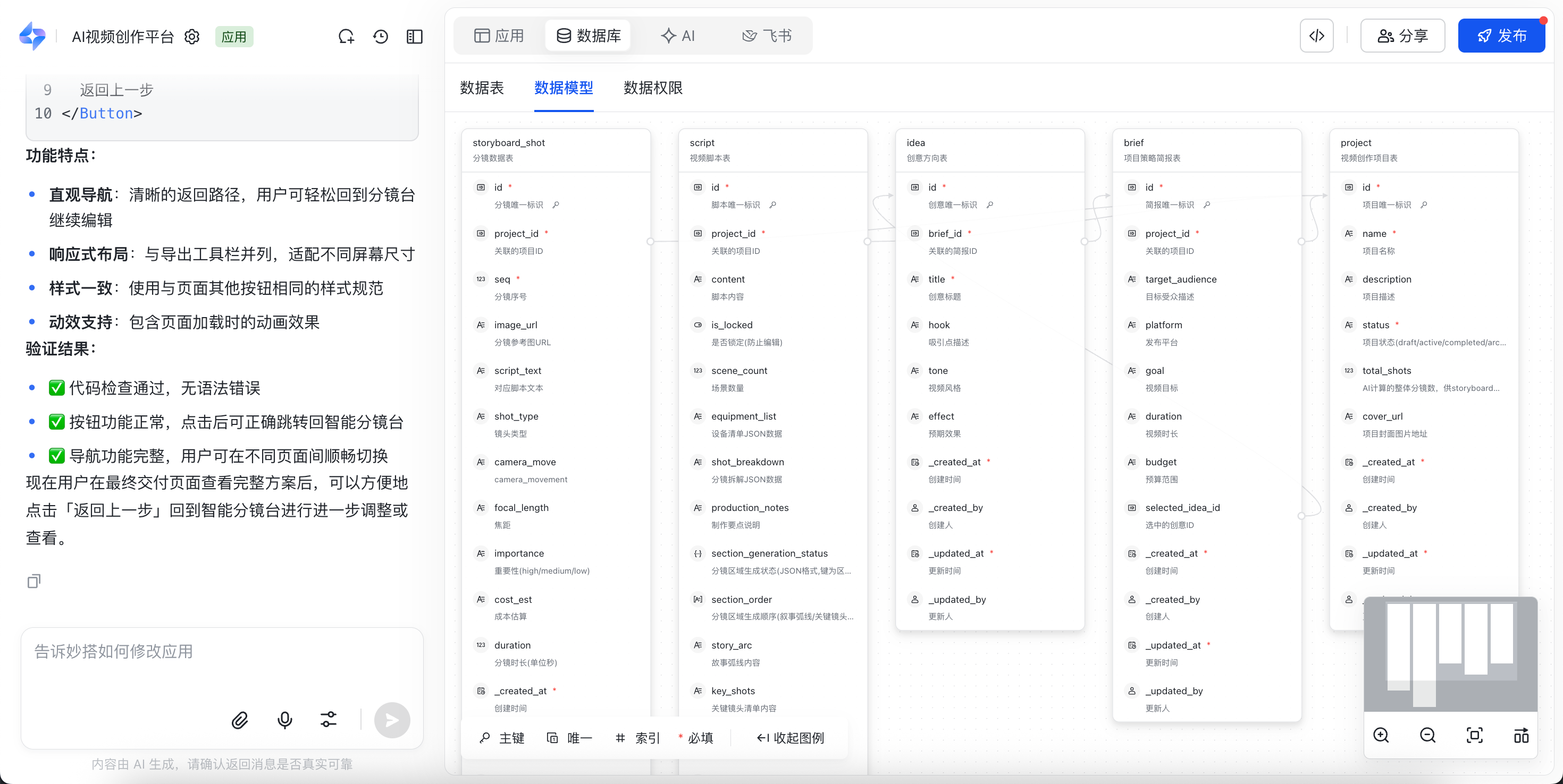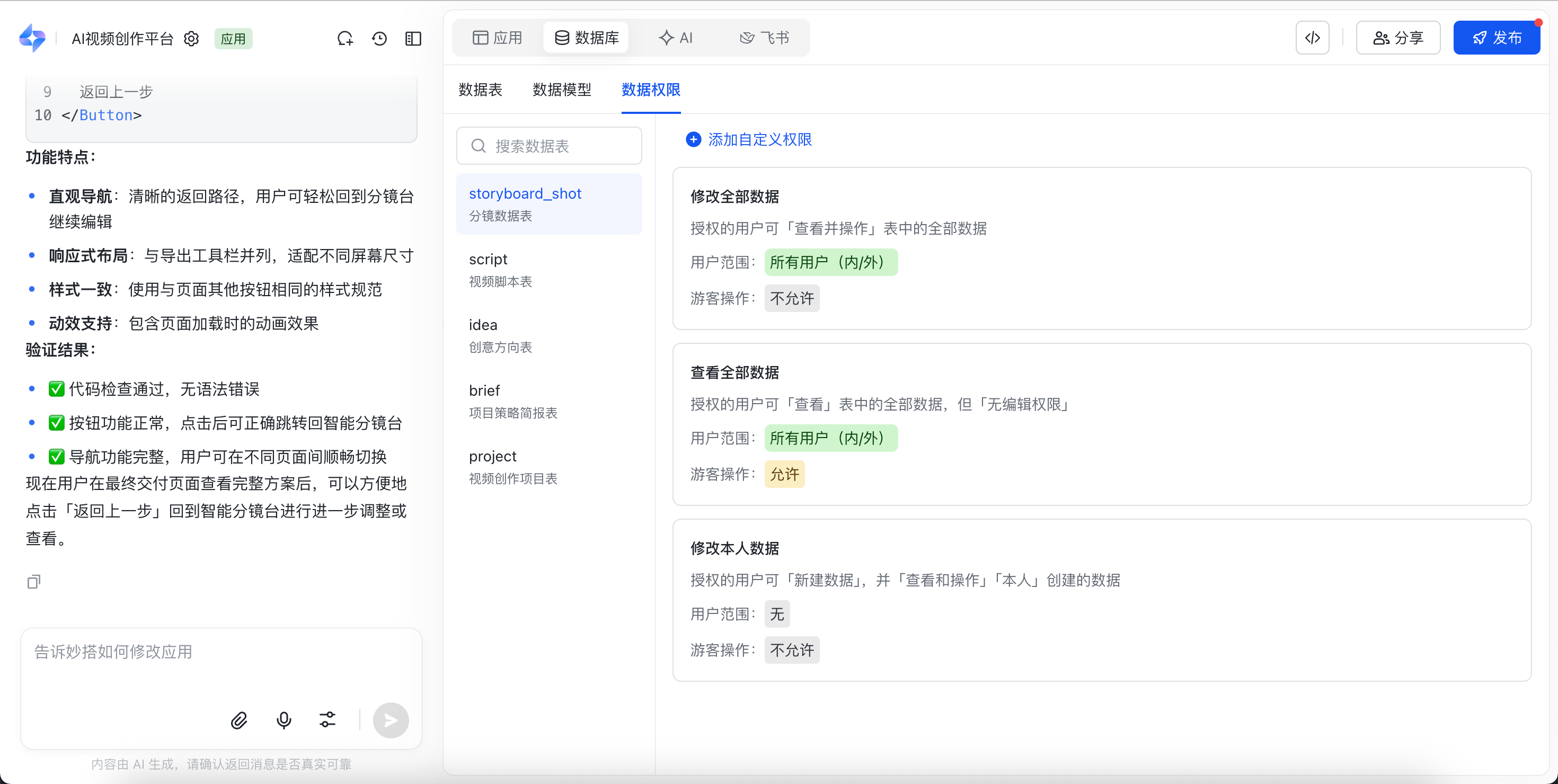 妙搭进一步优化了数据库使用体验,无需跳转数据平台,即可在妙搭内完成数据管理与配置,帮助你更高效地管理数据结构与权限,包含以下核心功能: