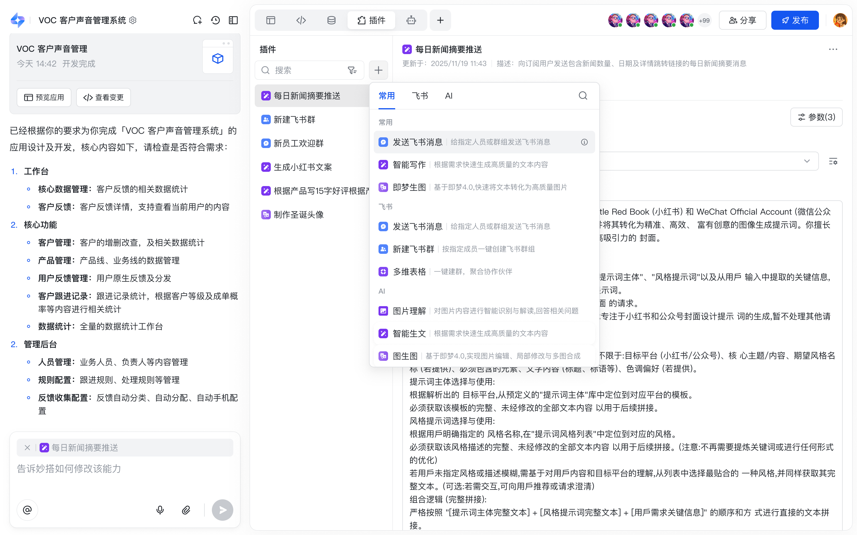 - 对话生成,上手即用:通过自然语言描述需求,系统自动生成插件配置,告别繁琐的参数设置