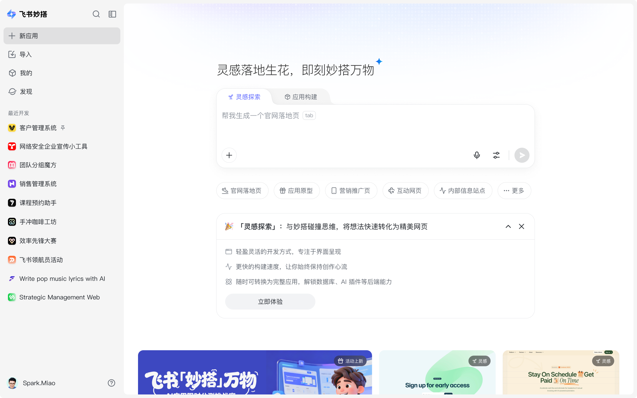 飞书妙搭新增“灵感探索”模式,简单描述你的想法创意,AI 会帮你规划结构、生成精美界面,几分钟即可获得一个可预览的成果。