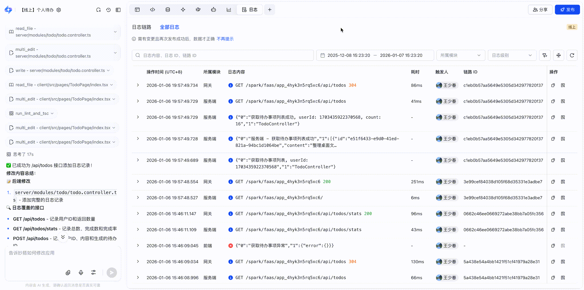 - 全部日志:应用开发者可以借此排查、复现问题发生的现场,解决常见场景的自运维问题。日志覆盖前端、服务端、网关等模块