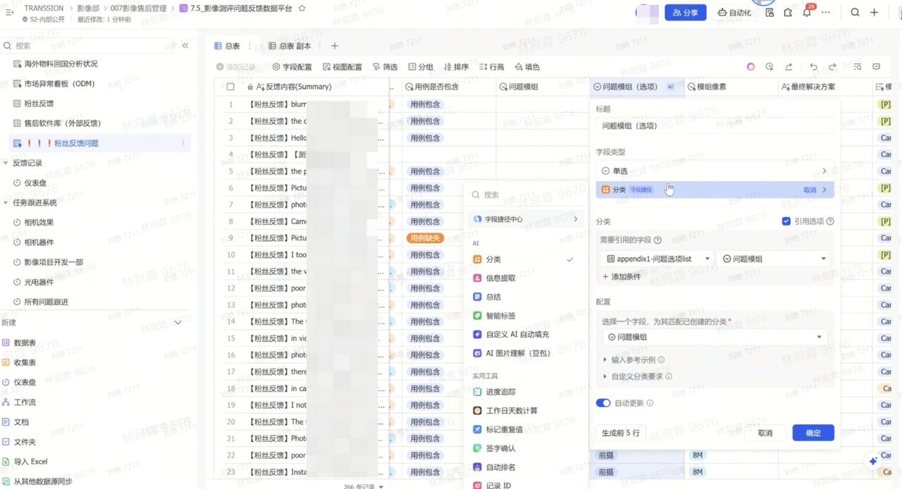 传音通过多维表格及其AI能力,搭建了统一的用户反馈数据平台,用于管理和分析反馈问题相关的所有数据,满足不同业务场景下的数据查看、处理和跟进需求。