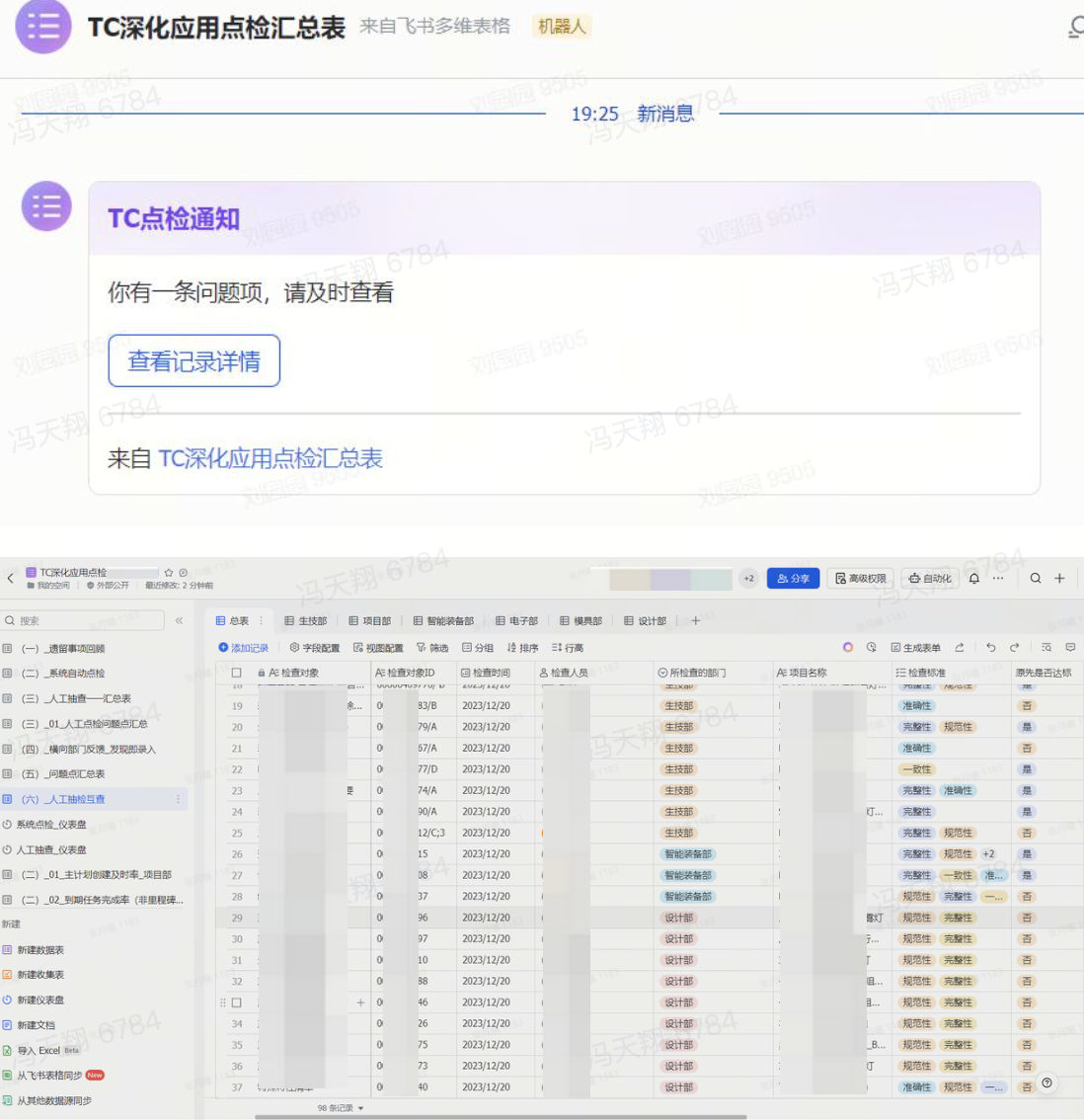 - 任务自动分配:通过数据集成,将PLM中的点检任务自动同步到多维表格,并自动通知责任人。