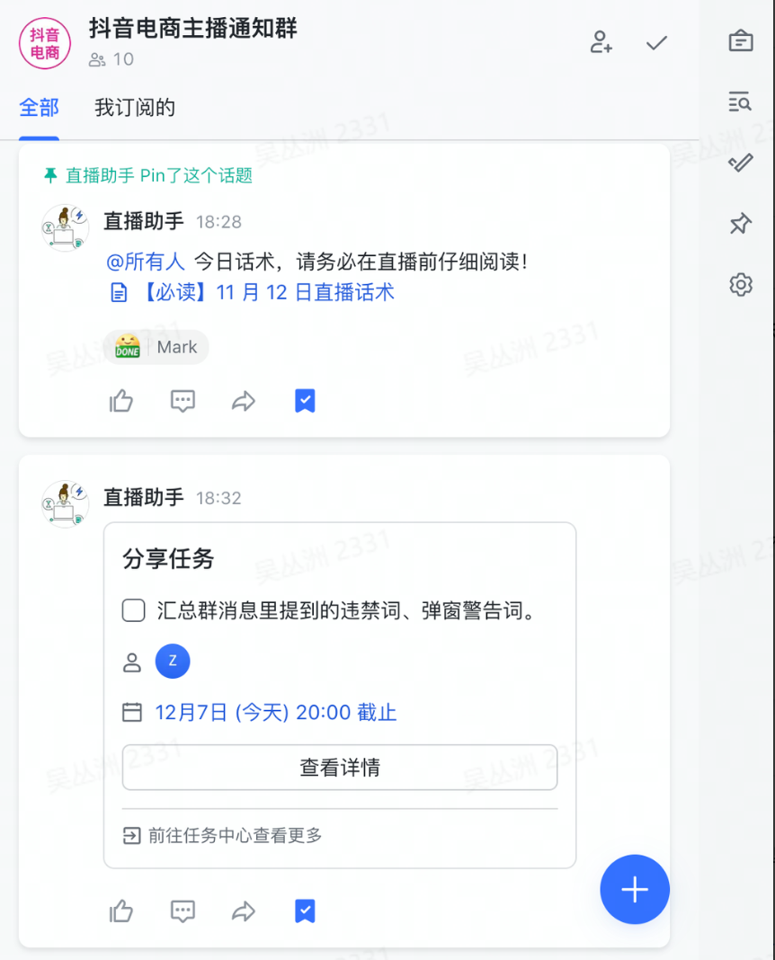 - 话题群极致降噪沟通,实时同步活动最新信息论坛式群聊,让通知消息和讨论消息分层展示,重要的通知不会被刷走,讨论的内容可以专门针对特定通知进行。