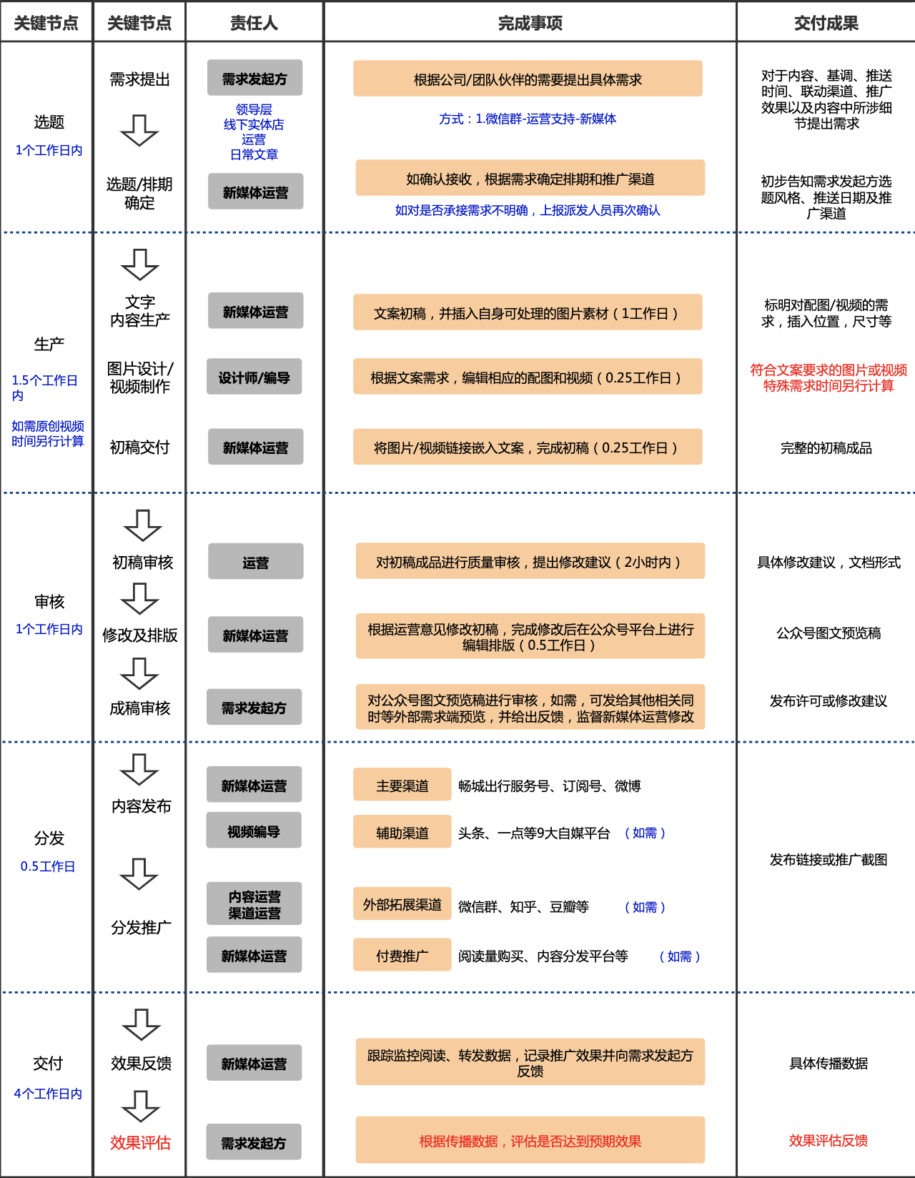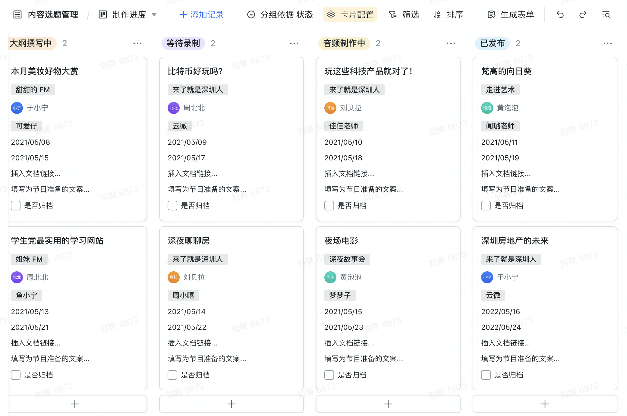 - 以多维表格管理市场推送素材,从渠道、选题、排期、内容生产、审核、分发、再到内容存档,新媒体推送内容管理一表管理,责任人清晰,进度明确;
