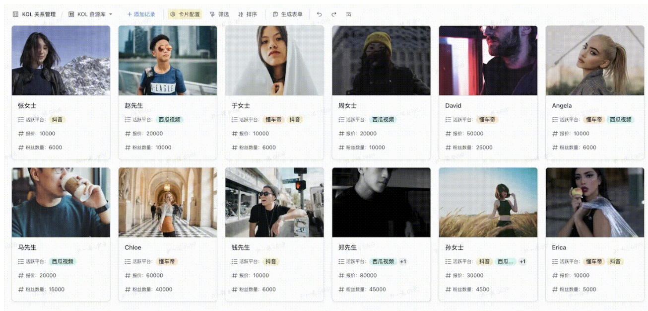 - 梳理达人线索,用多维表格各种不同的视图,能够更方便相关人员对资源库进行管理和检索,为后期的落地和执行打下基础。