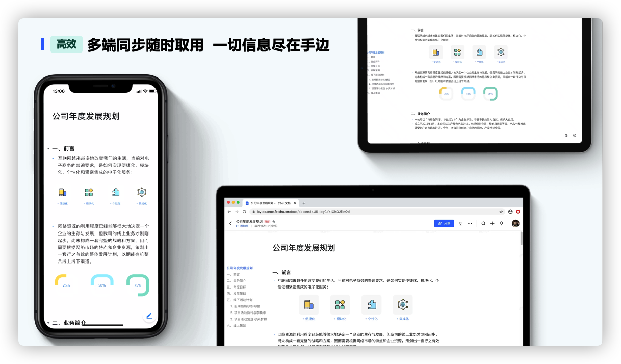 在移动化办公时代,飞书凭借着多端同步的能力,通过手机、ipad等移动设备,随时都可以查看所需的业务数据及信息,实现多人、跨部门协作,并且处理业务进展,有效解决了传统BI软件空间灵活性不足的缺陷,让数据随时在手头。