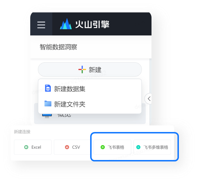- 火山ABI不仅能够与企业的第三方业务系统(例如车机系统、APP、社交媒体、质量工程等)对接,更能够直接采集来自于飞书电子表格、飞书多维表格的数据,助力企业进行全面的数据分析。